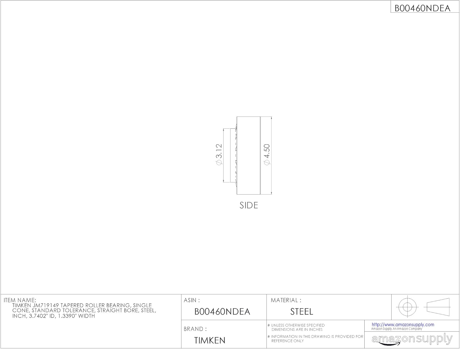 This Timken M719100 Series single cone with a stamped steel cage matches with a single cup (outer ring, sold separately) to assemble into a complete single tapered roller bearing, suitable for applications that support both radial and axial loads. The cone assembly does not contract or expand under operating temperatures ranging from -54 to 120 degrees C (-65 to 250 degrees F). Generally mounted in opposing pairs on a shaft to evenly distribute loads, this single cone is made of Timken's own high-alloy steel for durability, heat tolerance, and resistance to deformity under heavy loads. The stamped steel cage prevents rollers from coming into contact with each other during use, reducing friction, vibration, and noise. As part of a separable tapered roller bearing unit, this single cone assembly has an open design that allows for lubrication and accurate adjustments. This single tapered roller bearing is for use in high-load, moderate-speed applications that include automotive axle systems and conveyor systems in heavy duty industries such as mining, construction and agriculture, among many other applications.Specifications MetTapered roller bearings--Boundary dimensions and series designationsISO 355Inch part numbering systemABMA standard 19.2Width tolerance standardsISO 492Tapered roller bearing naming conventionsISO 720Rolling bearings use rolling elements to maintain the separation between moving parts to reduce rotational friction and support radial and axial loads. These elements can be one of the following types: ball, cylindrical, spherical, barrel, needle, spindle, or tapered. All rolling bearings are open, shielded, or sealed. Sealed bearings are lubricated with oil or grease in the bearing factory, while open and shielded bearings are meant to be lubricated in place, with periodic reapplication of lubrication, based on use. The shield protects the working parts of the bearing from environmental debris that may be introduced and could reduce the ball bearing speed and lifespan. Rolling bearings are used in a range of applications from agricultural machinery to conveying equipment, robotics, dental equipment, elevators, rolling mills, ship rudder shafts, and aggregate crushers, among others.The Timken Company manufactures a variety of bearings, alloy steels, and related components and assemblies that meet International Organization for Standardization (ISO) standards for quality assurance. Founded in 1899, the Timken Company is based in Canton, Ohio.
