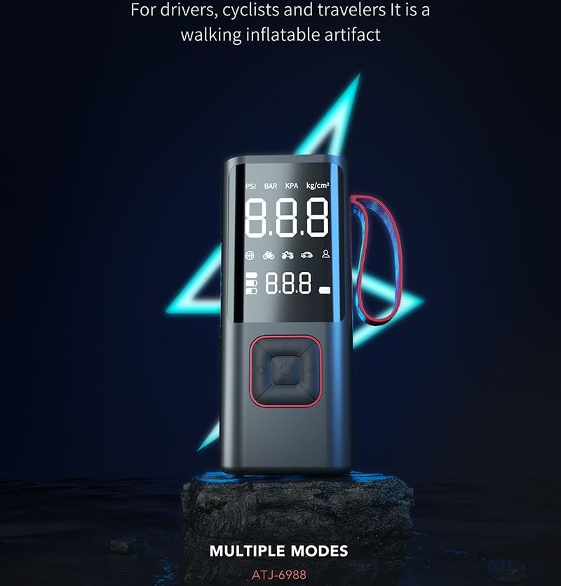 Use this multifunctional digital air compressor to control your tire maintenance. A clear LCD display screen displays pressure readings in multiple units (PSI, BAR, KPA, kg/cm ²) and comes with easy to read numbers. This portable inflator is designed for various vehicles including cars, motorcycles, and bicycles, and comes with all necessary accessories. The device has built-in LED lights, USB charging function, and automatic shutdown function, which can stop at a preset pressure level. This comprehensive kit includes multiple valve adapters, charging cables, and an extension hose for difficult to reach valves, with two power supply modes. Its compact design and convenient handle make it perfect for storage in the car, ensuring you are always prepared for unexpected pressure checks or tire inflation needs. The user-friendly interface allows for quick selection and monitoring of pressure, while the durable structure ensures reliable performance.
