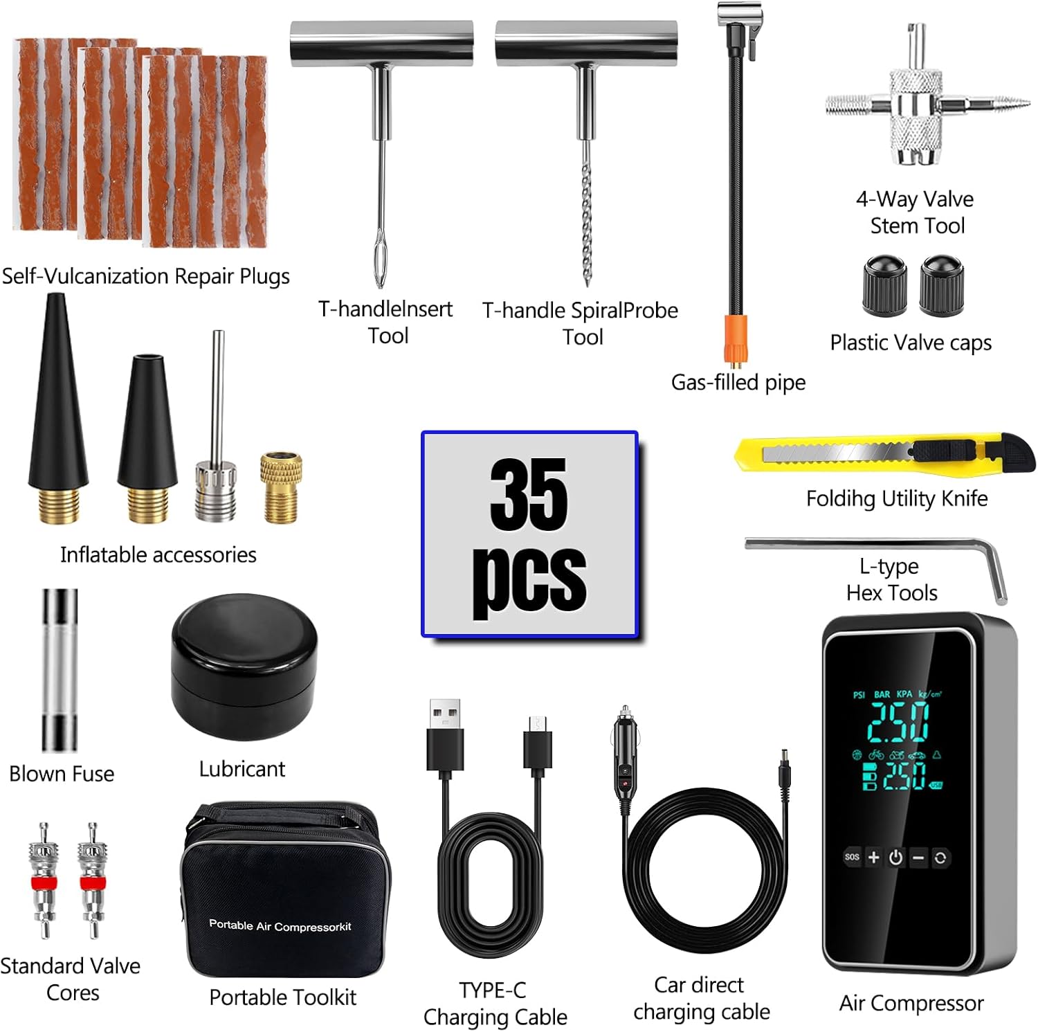 | Included Components | 1PCS *air compressor,15PCS *self-vulcanization repair plugs,1PCS *T-handlelnsert tool,1PCS *T-handle spiralProbeTool,1PCS *gas-filled pipe,1PCS *4-way valve stem tool,2PCS *plastic Valve caps,4PCS *inflatable accessories,1PCS *knife,1PCS *blown fuse,1PCS *lubricant,1PCS *L-type hex tools,2PCS *standard valve cores,1PCS *TYPE-C charging cable,1PCS *car directcharging cable,1PCS *portable toolkit |