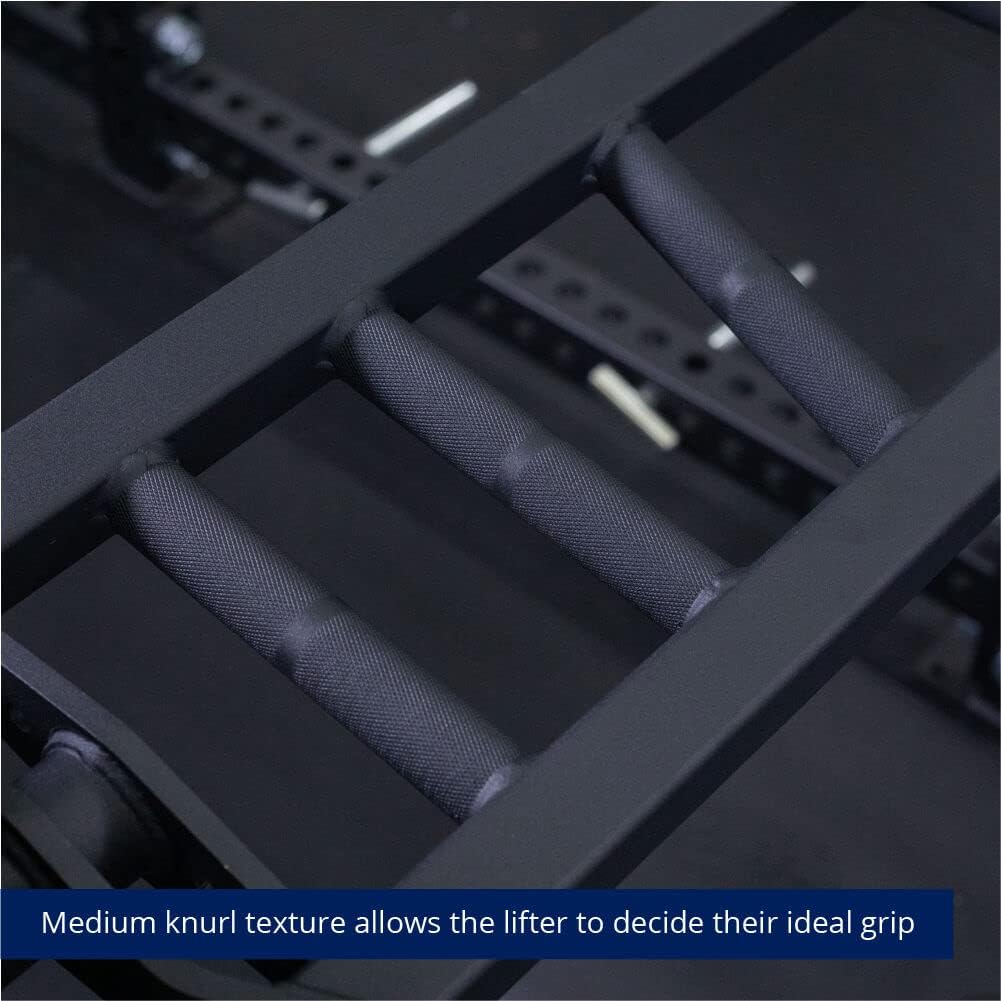 The Multi-Grip Barbell is constructed for the highest-level performance offering an enhanced frame with three various grip sets. Built to reduce stress on the wrists and shoulders, this bar makes curls, rows, and presses much more manageable and will expand your workouts. It features knurled textured grips with a single knurl mark to help keep a center hold on the bar. One set is angled 30-degrees and spaced 10" apart, and two sets of neutral grips are spaced 20" and 29" apart. Go from narrow to wide to hit different muscle groups, and enjoy the comfort of lifting with an angled neutral grip while reducing stress on your shoulders and wrists. The innovative design is crafted to hold a weight capacity of up to 1,900 LB and is compatible with most standard power racks and Olympic plates.IMPROVED VERSION 3: Our updated Multi-Grip Barbell now features a new frame width to allow for easy racking and knurl marks to help keep a center hold on the bar.FEATURES:- Rackable on standard Power Racks- Great hybrid bar to target specific muscle groups- One set of angled grips (30-degrees) spaced 10" apart- Two sets of neutral grips spaced 20" and 29" apart- Medium knurl texture allows the lifter to decide their ideal grip- Single knurl mark on each grip to tell where the center is- Fits Olympic-sized weight plates- NOTE: Spring Collars do NOT fit on the 48mm weight sleevesSPECIFICATIONS:- Grip Diameter: 32mm- Sleeve Diameter: 48mm- Overall Length: 82-in.- Grip Frame Width: 39.5-in.- Grip Frame Height: 10.25-in.- Grip Frame Thickness: 1.5-in.- Sleeve to Sleeve Length: 53-in.- Loadable Sleeve Length: 14.5-in.- Space Between Grips: 3-in.- Grip Length: 7-in.- Knurling: Medium Texture- Knurl Mark: Single- Finish: Powder Coated Black- Material: Steel- Weight Capacity: 1,900 lb.- Product Weight: 41 lb.