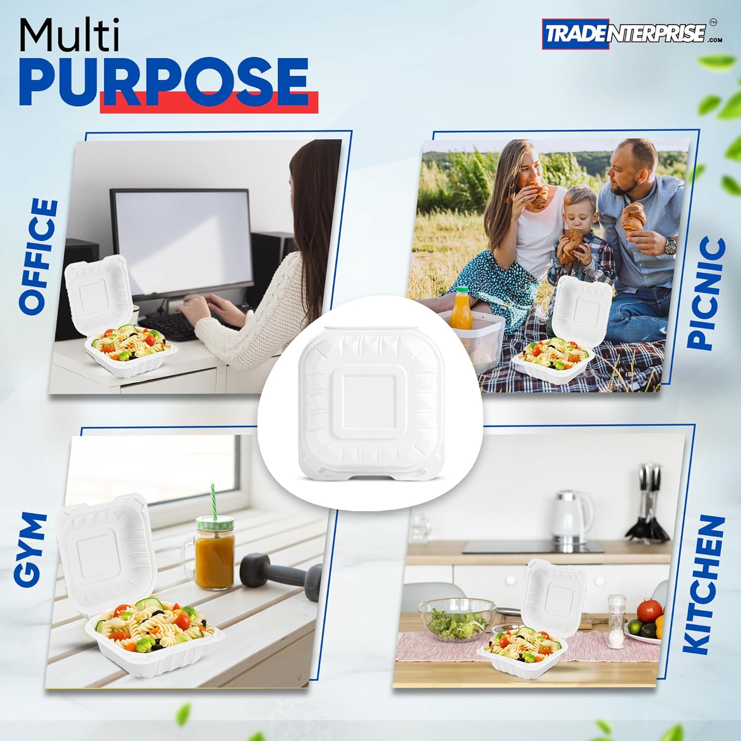 Hot or Cold Use: These to-go clamshell containers can be used for both hot and cold food items. They offer reliable strength and don’t contain wax lining. These containers are microwaveable and freezer-safe. They’re also oil-resistant and cut-resistant. Perfect for any occasion: Premium, environmentally friendly products and classic design, offers peace of mind for providing tableware for your family and friends. Perfect for camping, picnics, lunches, catering, barbecues, events, parties, weddings, and restaurants. 6”x6" Clamshell Container: serve full meals in a convenient style. They are perfect for serving main dishes with sides. The to-go containers make a great choice for daily meals, restaurants, food trucks, to-go orders, special events, and other food service environments.