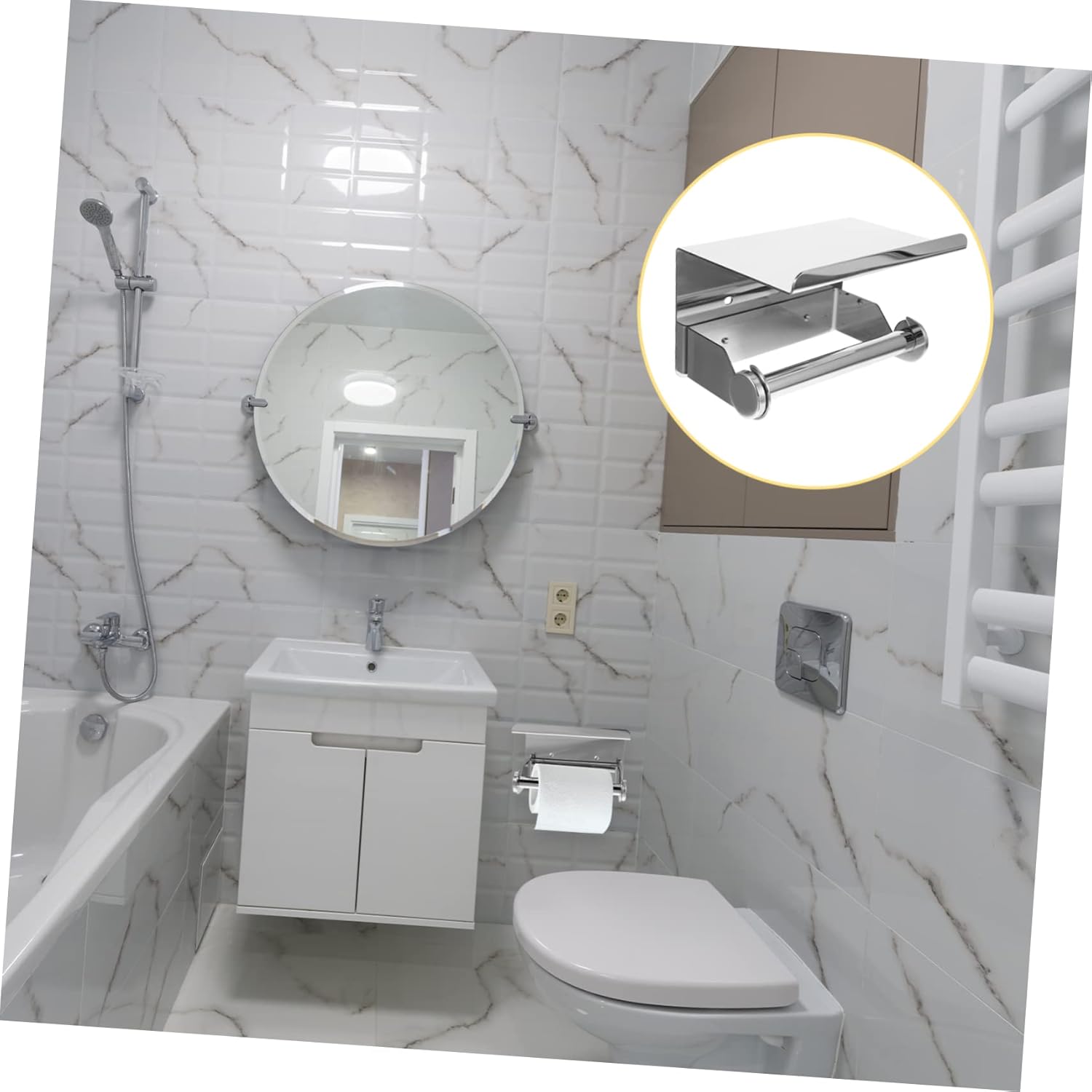 Package Include 1 x Toilet Paper Holder with Shelf Characteristics -Material:Stainless steel toilet paper holder - Size: 14.00X10.50X8.50cm/5.50X4.13X3.34in toilet paper holder for bathroom - Color: Silver toilet paper storage holder -Made of stainless steel, and reliable, excellent and for bathroom toilet paper holder with shelf. -Not only can roll paper be hung, but also can place some other small items, such as hair ties, phone toilet paper storage rack. -It is both toilet roll paper holder and wonderful storage rack, bearing capacity, wall mounted design toilet paper holder rack. -Its design is very easy to suspend roll paper and tissue, convenient and useful to your life toilet paper rack. -It can store roll paper, and has a simple design that can be integrated with any decoration toilet paper roll holder.Goods Informationtoilet paper can be a roll paper holder and meanwhile tissue storage holder.stainless steel toilet paper holder With shelf design, easy to hold phone.toilet paper holder This toilet roll paper holder with shelf is made of materials, which is for long-lasting use.toilet paper holder with storage The bar design, to hold roll paper, easy to remove installation and to replace paper towel