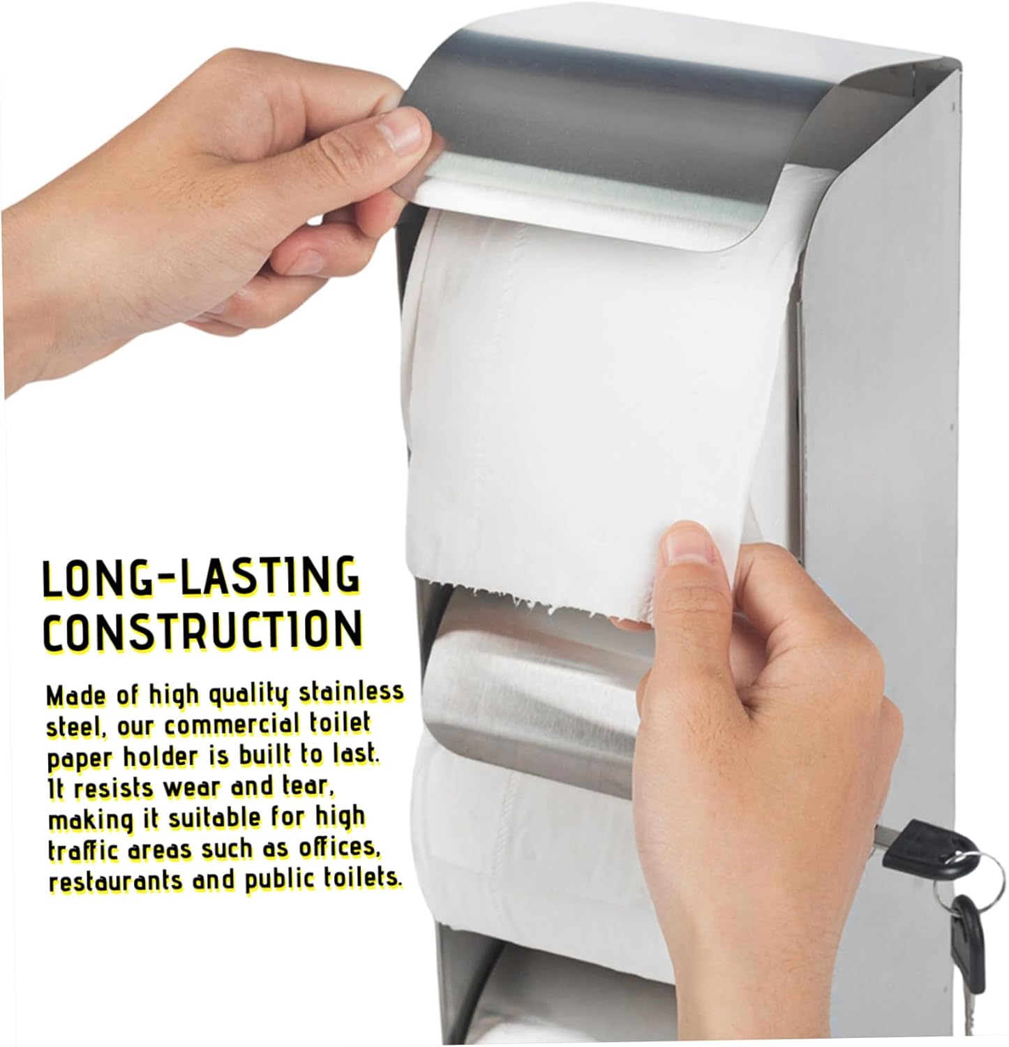Description: Toilet Roll Holder combines premium stainless steel durability with practical design, featuring triple roll capacity for reduced maintenance, a space-saving wall-mount setup ideal for commercial and public bathrooms, a splash guard that maintains cleanliness by protecting rolls from water damage, and a lock mechanism to roll theft or tampering; engineered for easy installation and maintenance, this commercial toilet paper dispenser is a reliable and hygienic bathroom accessory designed to enhance restroom functionality and user experience. Features:. Toilet Roll Holder. -Color: Silver. -Material: Stainless Steel. Note:Manual measurement, please allow slight errors on size.The colors may exist slight difference due to different screens. Package Including 1 x Toilet Roll Holder.