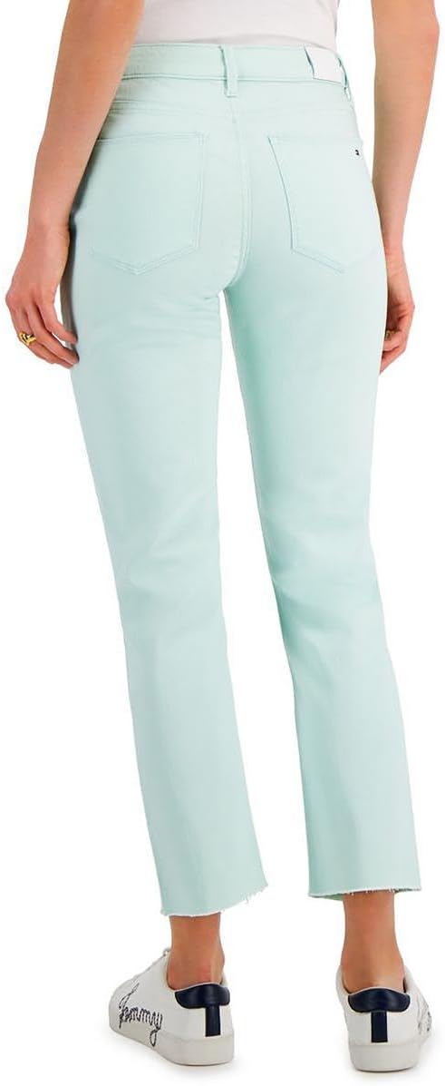 The raw hemline of this pair of straight leg ankle-length jeans from Tommy Hilfiger brings a well-loved look to your wardrobe that you can effortlessly pair with a graphic tee for a casually chic outfit. Approx. inseam: 27-1/2"; ankle length Approx. front rise: 9-3/4"; approx. back rise: 15"; straight leg Button closure; belt loops Raw hemline Cotton/rayon/spandex Machine washable Imported Web ID: 13737595