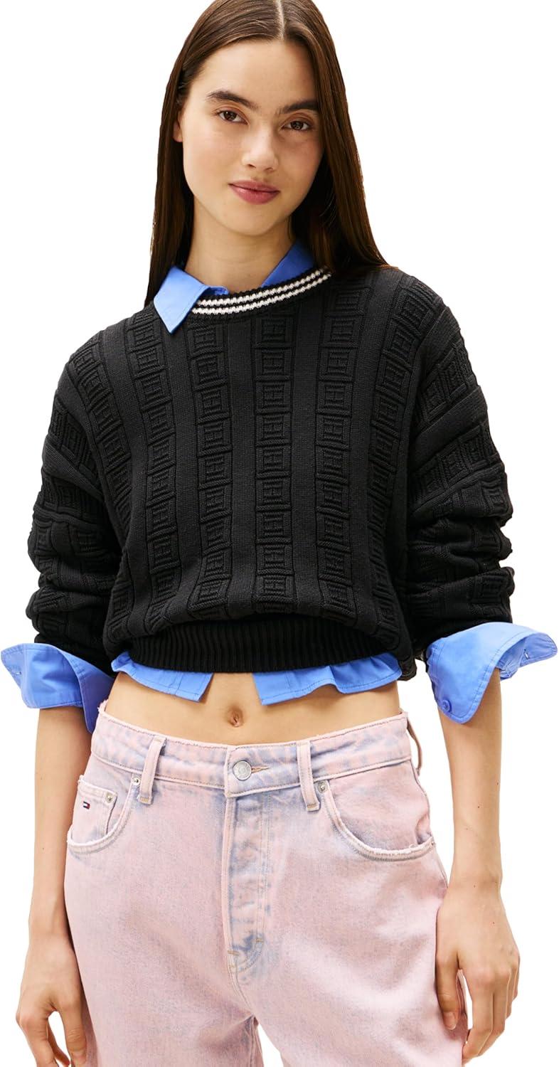 Introducing the Pullover Crewneck Sweater with Knit Flag Print from Tommy Jeans, featuring the iconic flag print and ribbed cuff, hem, and collar crafted from100% cotton for unparalleled comfort. Complete with knit flag logo, this lounge sweater offers both style and functionality. The soft construction ensures warmth without sacrificing breathability, making it perfect for everyday wear. With its relaxed silhouette, this pullover sweater strikes the ideal balance between comfort and style, flattering the silhouette while providing ample room for movement. Pair it effortlessly with your favorite Tommy Hilfiger shirts, tees, shorts, pants, jeans, jackets, or coats for a versatile and timeless look suitable for any occasion, whether casual or formal. Whether you're heading out for a day of leisure or hitting the gym, this sweater is the ultimate go-to. Treat yourself or surprise a loved one with this versatile wardrobe staple, ideal for mothers, sisters, girlfriends, wives, daughters, or friends. Experience the unmatched quality and everyday style of Tommy Hilfiger with this must-have women's sweater.