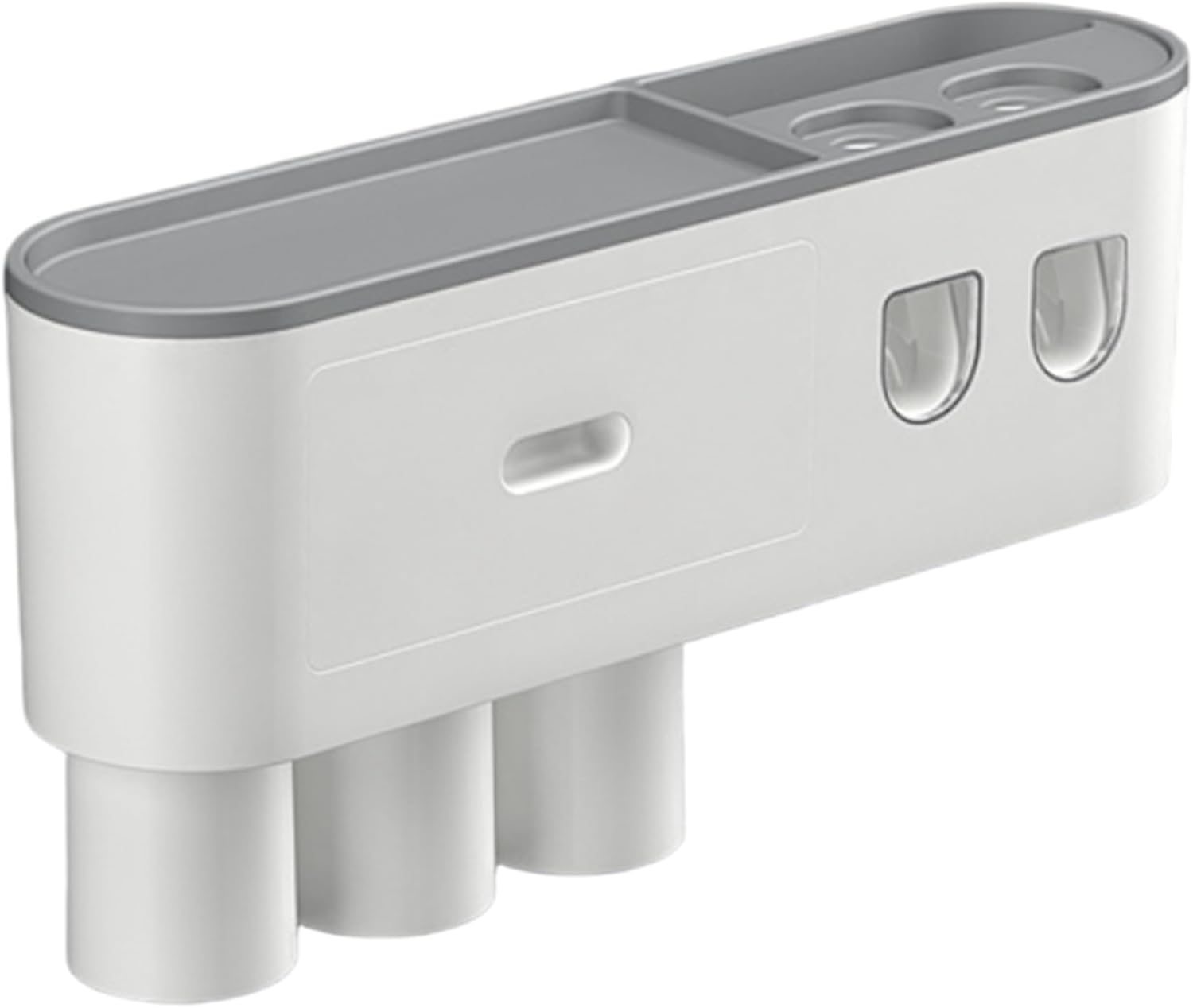 Description: Create a more organized bathroom space with our wall-mounted toothbrush holder. It combines two automatic toothpaste dispensers that help dispense a measured amount, potentially cutting down on waste. The unit holds two cups upside down using magnets, promoting airflow and faster drying after use. Six brush slots keep toothbrushes orderly and separated. Except oral care, the organizer provides extra utility with its open tray and concealed drawer, perfect for storing small bathroom commodities. The installation process is simple and requires no holes or tools when using the adhesive on suitable walls. Made from gray ABS plastic, this organizer is made to last and simplify your daily routine through thoughtful design.Features:. Automatic Toothpaste Dispenser. -Color: Gray. -Material: Plastic. Note: Manual measurement, please allow slight errors on size. The colors may exist slight difference due to different screens. Package Including 1 x Automatic Toothpaste Dispenser