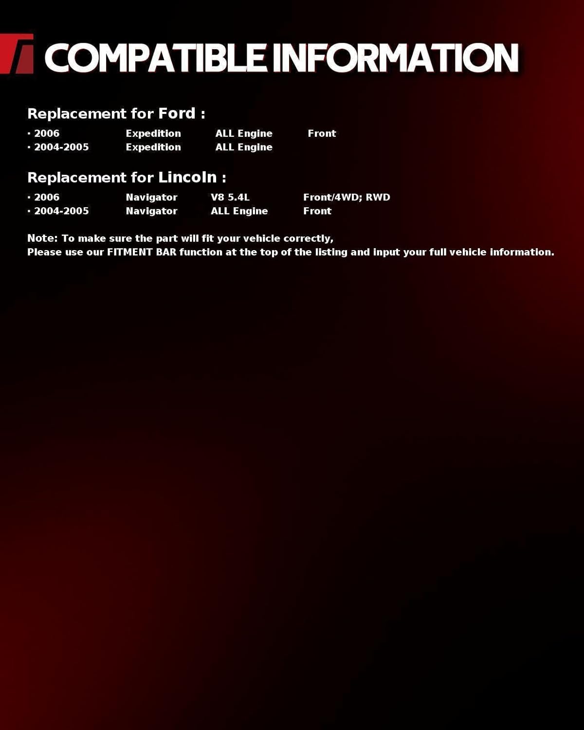 | Manufacturer Warranty Description | NOTE: Please check with the "Amazon Confirmed Fit" or the detailed fitment info in the production description below to make sure that is the correct part for your vehicle |