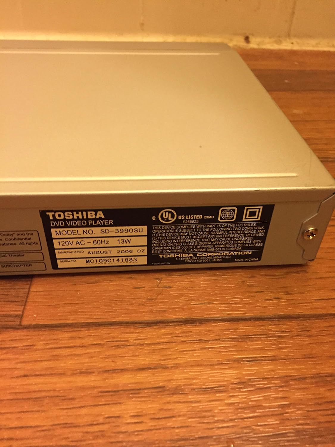 Product Description SLIM PROGRESSIVE DVD PLAYER W/ DIVX Amazon.com Nicely affordable yet packed full of powerful video and audio playback features, the Toshiba SD-3990 single-disc, progressive scan DVD player has a stylishly silver, super-slim profile that measures just 1.65 inches high. It's also compatible with a wide variety of disc and digital file formats, including DVD-R/RW, CD-R/RW, and VCD discs as well as MP3, WMA, and JPEG (Kodak Picture and FujiColor CDs) content burned to disc. It's also DivX Home Theater Certified, meaning that it's compatible with video burned to disc using both the DivX video format. The SD-3990 performs 3:2 pulldown detection and reversal, too--a handy feature for watching progressive-scan movie programs in their native 24-frame format. To adapt 24 frames-per-second movies to 30 fps video, frames in the original movie must be duplicated; 3:2 pulldown digitally corrects this duplication by removing the redundant information to display a frame-accurate picture. With the JPEG Viewer, you can easily display your favorite digital photos and create custom slideshows with a few simple clicks of the player's remote control. The interactive Digital Picture Zoom feature allows you to select an area of the video from a DVD and magnify it. Other DVD playback features include fast scan, slow motion, multi-angle selection, multi-subtitle selection, and parental lock. You get vivid, realistic sound, thanks to Toshiba's 24-bit/192 kHz pulse code modulation (PCM) audio processor. PCM audio translates digital signals from your DVDs and CDs into warmer, natural sound. The DVD player offers Dolby Digital and DTS decoding, and you can connect to a multi-channel home theater surround sound system via the coaxial digital audio output. It also produces 3D virtual surround sound from two speakers. It features the following video and audio connections: Composite A/V: 1 S-Video: 1 Component Video: 1 Digital audio: 1 coaxial Tech Talk DivX is a compressed digital video format (like MP3) that's based on the MPEG-4 video compression standard. It can reduce the video from a DVD (MPEG-2) to around 10 percent of its original size while still retaining good video and audio quality, enabling you to store several two-hour length movies on burned DVD media. Component video (also called Y/Pb/Pr) features a three-jack video input, which provides separate connections for luminance (Y), blue color difference (PB) and red color difference (PR). This results in increased bandwidth for color information, resulting in a more accurate picture with clearer color reproduction and less bleeding than you would get with S-Video or composite (RCA yellow video plug) connections. You will need a separate RCA left/right audio cable for sound. What's in the Box Single-disc DVD player, remote control (with batteries), printed operating instructions