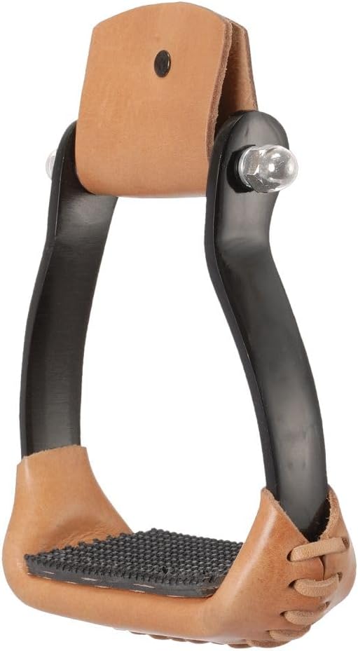 Tough-1 Aluminum Barrel Stirrups From the original Royal King. Polished aluminum stirrups with rubber grip fastened to 2 1/4" leather tread to help prevent losing stirrups during a run. 3" neck. 5" foot base. Add a little color to your western saddle with these stirrups! Chrome screws.