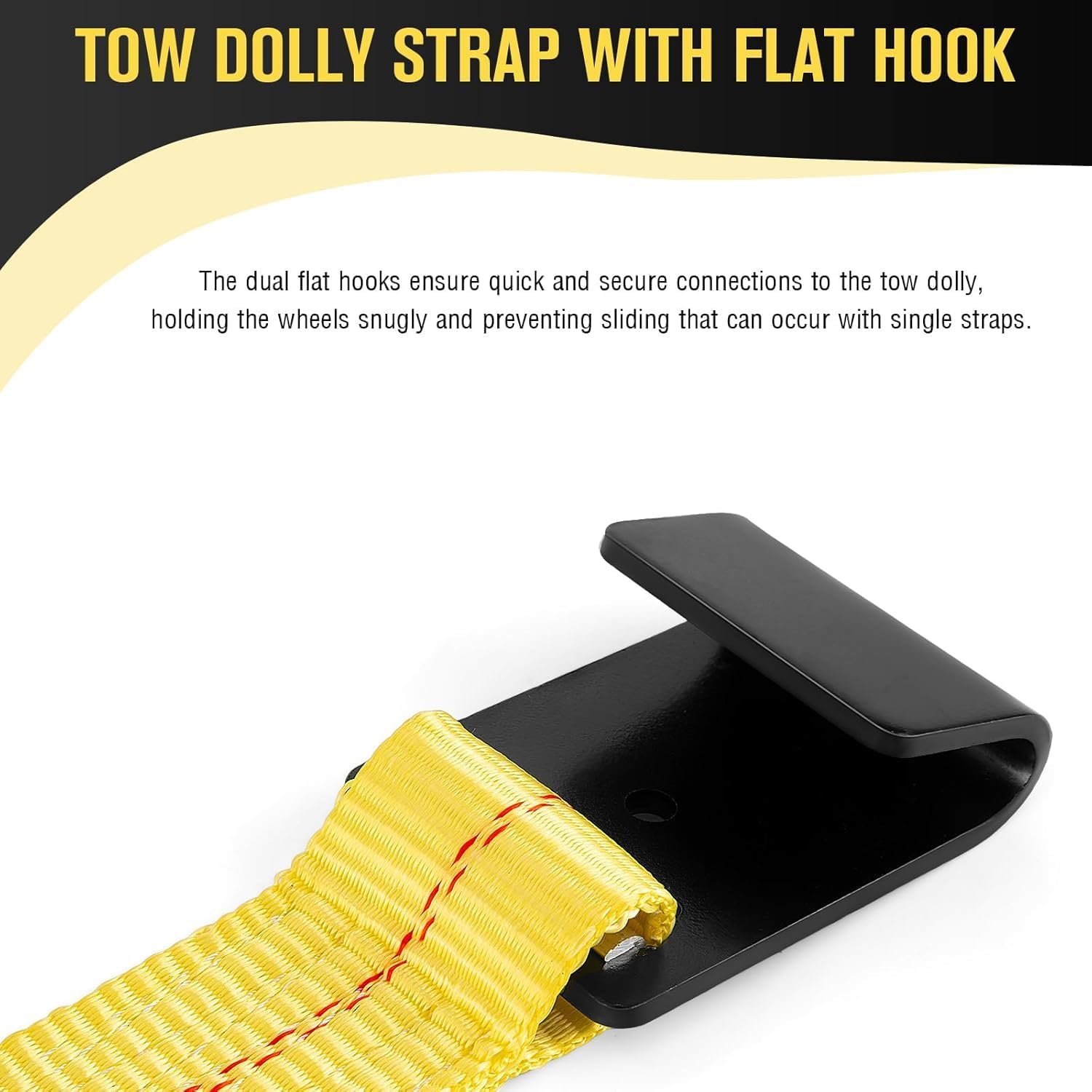 Car Dolly Straps - Reliable and Heavy-Duty Tow Dolly Tie-Downs, Adjustable Tire Straps with Hooks for Safe Vehicle Transport HEAVY-DUTY TOW DOLLY STRAP Equipped with heavy-duty ratchet buckles, our tow dolly wheel strap offers effortless tensioning and secure locking, minimizing the risk of slippage. The ergonomic handles provide a comfortable grip, allowing you to quickly and easily secure your vehicle with minimal effort. ENHANCED SAFETY The bright, reflective stitching ensures high visibility in low-light conditions, while the integrated wear sleeves protect the tow dolly tire strap from abrasion and damage, prolonging its lifespan. The reinforced hook-and-loop fasteners keep excess strap neatly secured, preventing any loose ends from interfering with your towing operation. Why Choose Our Tow Dolly Basket Strap? With our heavy-duty tow dolly tire basket straps, you can trust that your vehicle is securely fastened and protected during transport. No more worries about shifting or loosening straps – our tow dolly tie down straps provides the stability you need for a smooth and safe towing experience. SPECIFICATIONS Material: Industrial-grade Polyester Webbing Tow Dolly Strap Color: Yellow Working Load: 10,000 lbs Assembly Break Strength: 35,000 lbs Webbig Brake Stength: 12,000 lbs Webbing Width: 2.1 inch Ratchet Buckle: Heavy-duty Steel Ending Fitting: Black Flat Hook Product Type: Tow Dolly Straps/ Wheel Net Fit Tire/Wheel Size: 15in.-19 in. Reflective Stitching: Yes Weather-Resistant: Yes