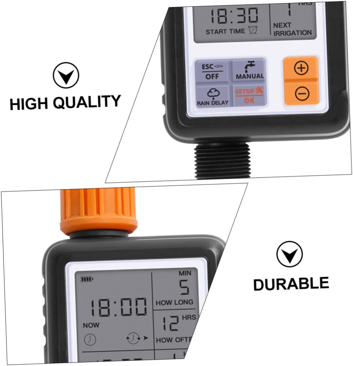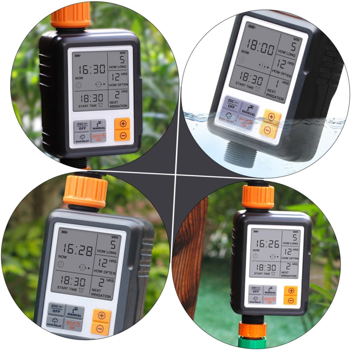 Package List 1 set x automatic water timer kit Characteristics -Color:Black Irrigation Timer -Water Outlet: 3/4" outer thread Irrigation Controller. -Material: Plastic Garden Irrigation Timer. - Battery: 2 x AA batteries(Not included) Digital Water Timer. -Water Inlet: 3/4" internal thread Automatic Watering System. -Size: About 16.00X5.50X8.00cm/6.29X2.16X3.14in Timing Watering Device. - The screen will auto off in 30s of no button operation to battery life Irrigation Watering Timer. - It’s also applicable in sprinkling and drip irrigation systems, rain buckets, pet water feeding, etc. Watering System Controller - Built-in lock function prevents water waste and destroyed watering plan caused by mistaken trigger Watering Device. - This automatic irrigation timer can be used for watering lawns, flowers, plants and pots in gardens, vegetable gardens, patios, etc. Gardening Watering Timer - The large LCD display makes it more interactive and easy-to-read. Digital Irrigation TimerGoods DescriptionWatering System Controller Can adjust the watering time to meet the needs of different flowers.Irrigation Controller A automatic watering timer, made from material, is and for long time use.Automatic Watering System for garden and home use.Watering Device one of for you