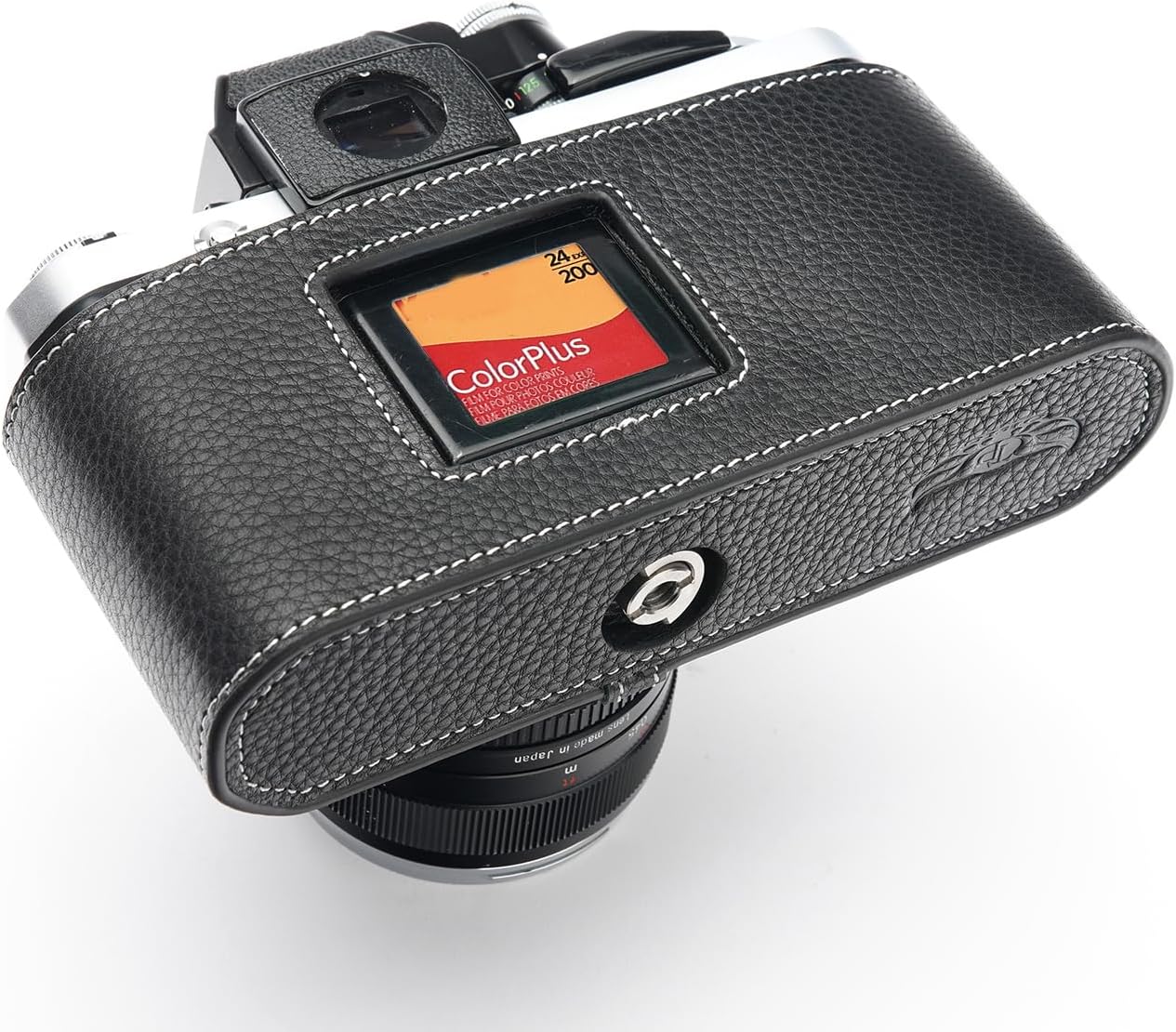 This camera case is all handmade by real top layer cow leather, the design is simple and vintage, use Metal sizing techniques make it very fit with the camera body. Inside lining use high lever velvet to protect camera body for scratch and coloration.Under base screw is made by 304 stainless steel and it can easy take off by hand. You don't need to take off the half case when you use tripod.Content: 1 pc camera half case, not include camera and strap.Material:real cow leather.Color: Black.