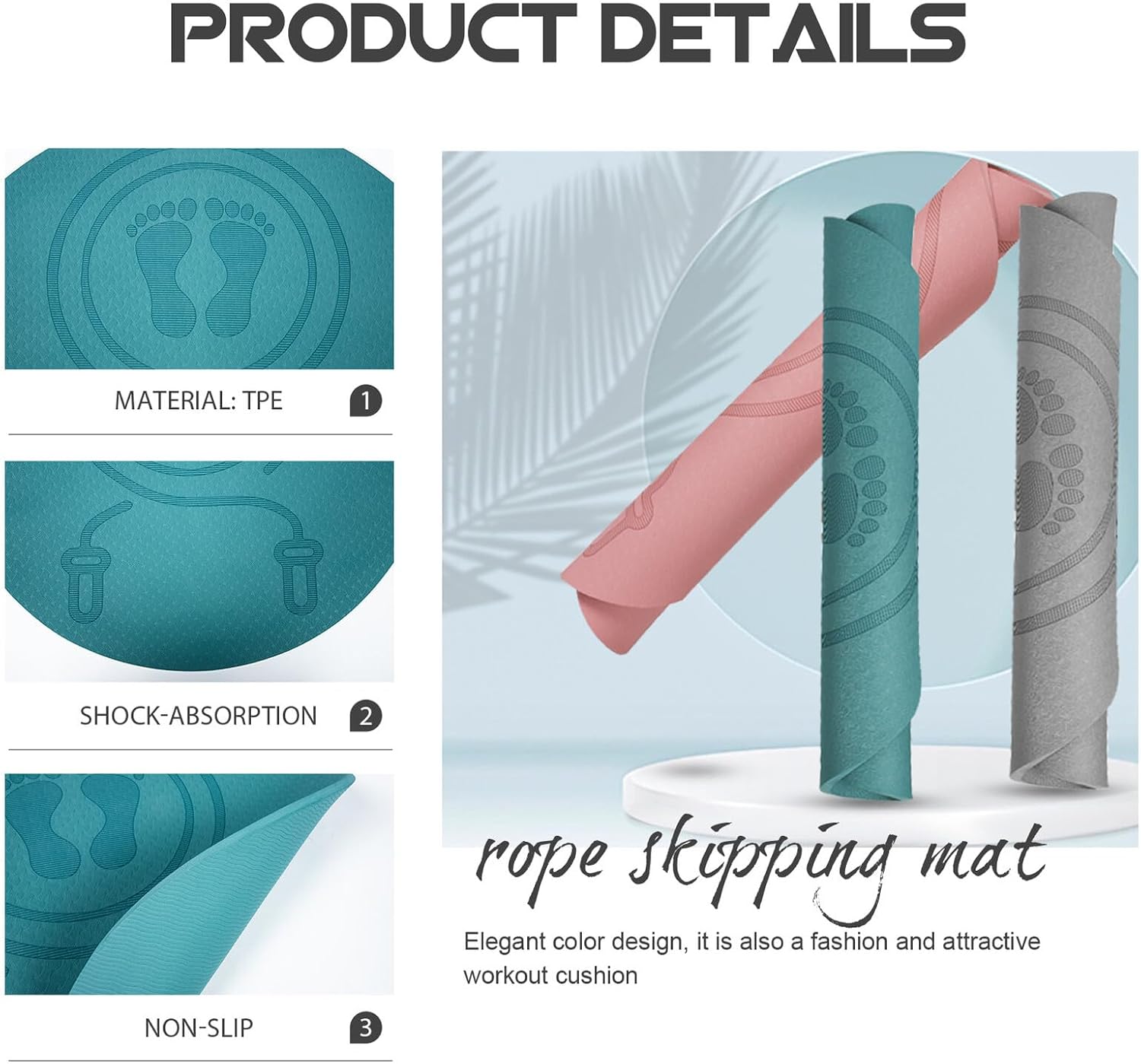 Package List 1 x jump rope mat Features -Product Info:Anti-slip skipping rope mat -Material: TPE jump rope mats. -The cushion is shock-absorbing, non-slip, gentle, and support your long-term use skipping rope mat. -It can be used as a practical gift for your friends. They will be very happy fitness exercise mat. -The mat is both comfortable and able to , making exercise easier jump rope mute mat. -Made of , can be used for a long time, and is not easily deformed and damaged stationary bike mat. -These cushions can reduce foot and reduce fatigue during jumping or exercise jump mat.Goods Descriptiongym mat Do you need a jump rope mat that will cushion and provide support for joints, knees, elbows, hands and feet while to try to hold long and challenging jump rope? Then, our comfortable jump rope mat is specially designed for you.outdoor climbing mat Wise choice for your daily exercise