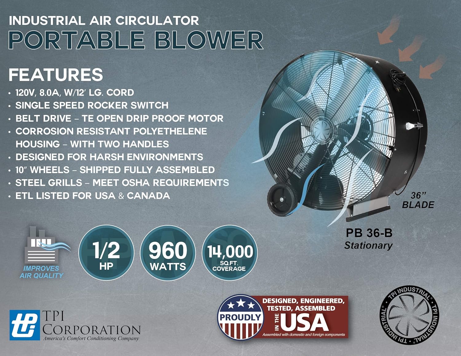 | Item Type Name | TPI Corporation PB-36-B Standard Belt Drive Portable Blower – Single Phase, 36" Diameter, 120 Volt for Heating, Ventilating. Heating Accessories |