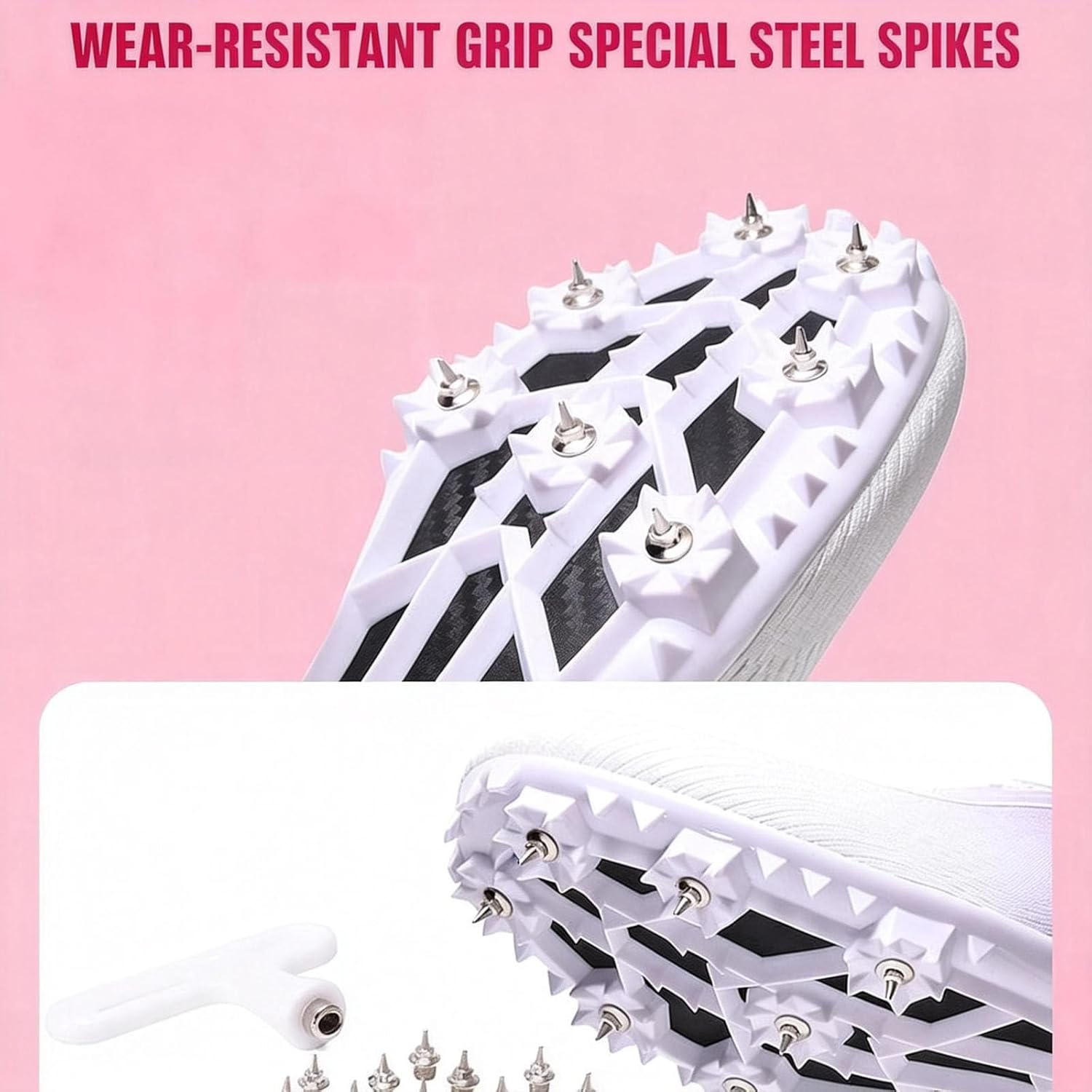 track spikes shoe takes durable rubber outsole and adjustable nails, not only speed up while racing running, but also provide excellent performance fits in all conditions.Perfect for all types of Track & Field activities from sprinting to long jumping, the Track and Field Shoes will never slow you down.The Track shoes offer maximum grip when navigating the different surfaces, allowing you to keep up with ease during your events.Soft, damping and breathable insole reduce pressure and provide awesome performance fits during racing, running, sprinting, jumping.Spikes: 7 nails and extras for replacementsMaterials: High level PU with air mesh for feet in sporty experience4.5 US/2.5 UK=Foot Length:8.86in (225mm)5.5 US/3.5 UK=Foot Length:9.06in (230mm)6.5 US/4 UK=Foot Length:9.25in (235mm)7 US/5 UK=Foot Length:9.45in (240mm)7.5 US/6 UK = Foot Length: 9.65in (245mm) 8 US/6.5 UK = Foot Length:9.84in (250mm) 9 US/7 UK = Foot Length:10.04in (255mm) 9.5 US/8 UK = Foot Length: 10.24in (260mm)