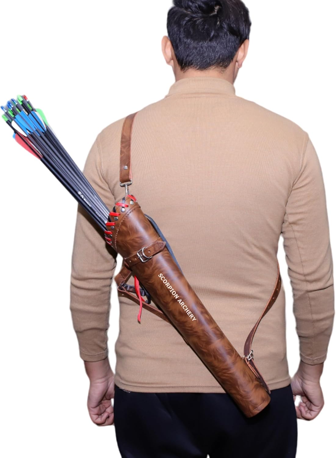 NJOY THE ARCHERY.We insist to provide the security and comfortable products for Archery Lovers.Aiming to bring the great service and deliver the great product to archers.Traditional Shoulder Back Quiver Leather Arrow Holder Handmade Straps Belt High: 18 Inches Types: Back quiver Suitable for both Left & Right Hand. Suitable for riding and shooting, outdoor hunting and so on