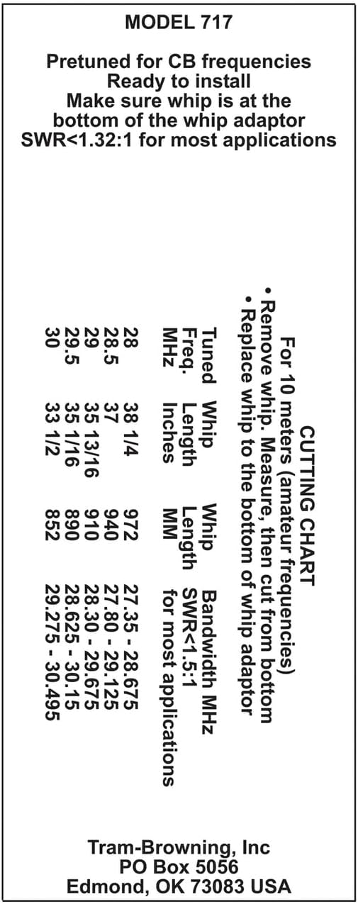 Product Description If you're concerned about your antenna handling wind resistance, a coil antenna is a must. This Tram Oil-Filled Coil CB Antenna is very heavy-duty with great field strength. It accepts a standard 3/8 in. x 24 thread mount—just be sure to buy a heavy-duty one to keep this antenna firmly seated! Manufacturer Contact Information EDMOND, OK, 73013 US