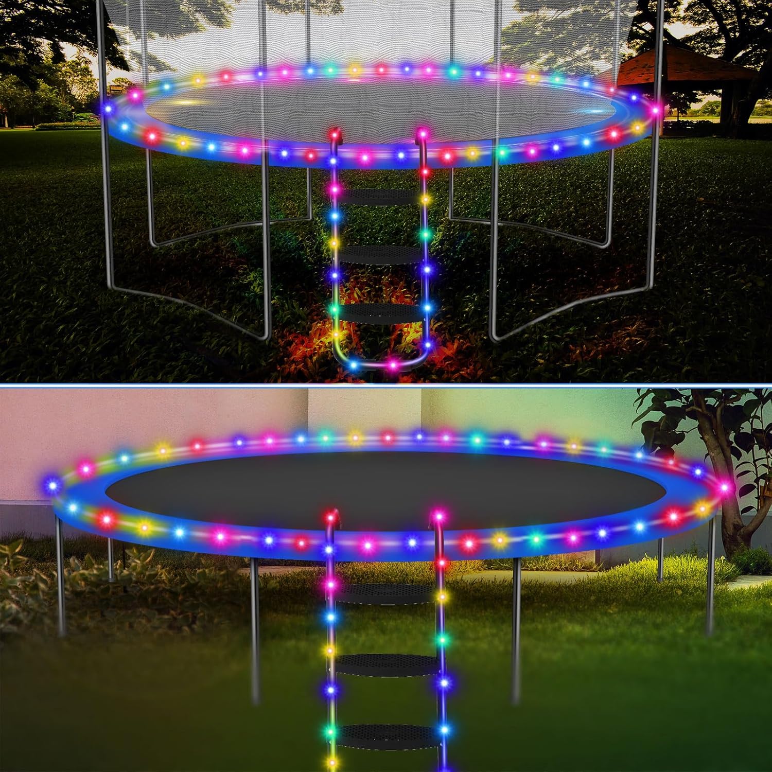 Features: This trampoline accessories bundle is nice for various seasons. You can enjoy the LED light display during those dark winter evenings, cool down in summer with the trampoline sprinkler, and stay safe with secure steps and stakes. This package keeps a fun and safe jumping experience all year round. Our trampoline accessories package keeps durability and user safety. The trampoline steps are made of a sturdy blend of plastic and steel, designed to support up to 220 lbs. Our trampoline stakes and anchors are made from galvanized iron material, ensuring that your trampoline stays securely in place, regardless of the weather conditions. Specifications: Material: Trampoline steps: plastic and steel Trampoline stakes and anchors: Galvanized iron material Color: mainly black Size: LED trampoline lights: 72ft Trampoline sprinkler: 39.4ft Trampoline stakes: 15.8 x 3.2 inches Trampoline steps: 37.8 x 13 inches Package includes: 1 x Trampoline steps 1 x LED trampoline lights 4 x Trampoline stakes with 4 belt and t hooks 1 Set 39.4ft trampoline sprinkler 1 Set trampoline basketball hoop dartboard Notes: Manual measurement, please allow slight errors on size. The color may exist a slight difference due to different screen displays Warm reminder: "For safety and longer life, always fully unfold the bulbs before use. Bundling them can cause overheating and hazards."