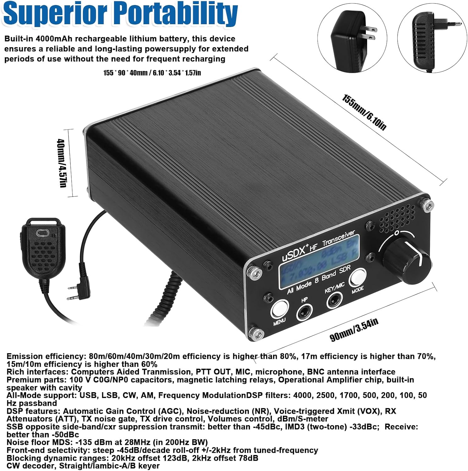 lithium battery, this device ensures a reliable and long-lasting powerply for extended periods of use without the need for frequent recharging. Perfect for various operation scenarios. Specifications: Name: SDR Transceiver Material: metal Battery: 1 * biult-in 4000mAh battery (included) Radio frequency output: 10W maximum at 13.8V exit direct t in Frequency s: 3.5-30 enna/connector: 50ohms/SO-239 Full mode port: usb, lsb, cw, am, frequency modulation Bands: 80m/60m/40m/30m/20m/17m/15m/10m Emission efficiency: 80m/60m/40m/30m/20m efficiency is higher than 80%, 17m efficiency is higher than 70%, 15m/10m efficiency is higher than 60% Rich interfs: Computers Aided Tranmission, PTT OUT, MIC, microphone, BNC enna interf Premium parts: 100 V C0G/NP0 acitors, magnetic ing relays, Operational Amplifier chip, built-in speaker with cavity All-Mode port: USB, LSB, CW, AM, Frequency ModulationDSP filters: 4000, 2500, 1700, 500, 200, 100, 50 Hz passband DSP features: tomatic Gain Control (AGC), Noise-reduction (NR), Voice-triggered Xmit (VOX), RX Attenuators (ATT), TX noise gate, TX drive control, s control, dBm/S-meter SSB opposite side-band/cxr pression transmit: better than -45dBc, IMD3 (two-tone) -33dBc; Receive: better than -50dBc Noise floor MDS: -135 dBm at 28 (in 200Hz BW) Front-end selectivity: steep -45dB/decade roll-off +/-2kHz from tuned-frequency Blocking dynamic s: 20kHz offset 123dB, 2kHz offset 78dB CW decoder, Straight/Iam-A/B keyer Item size: 155 * 90 * 40mm / 6.10 * 3.54 * 1.57in Item weight: 425g / 0.94lb Package size: 170 * 128 * 80mm / 6.69 * 5.04 * 3.15in Package weight: 510g / 1.12lb Packing List: 1 * SDR Transceiver 1 * Microphone 1 * Adapter