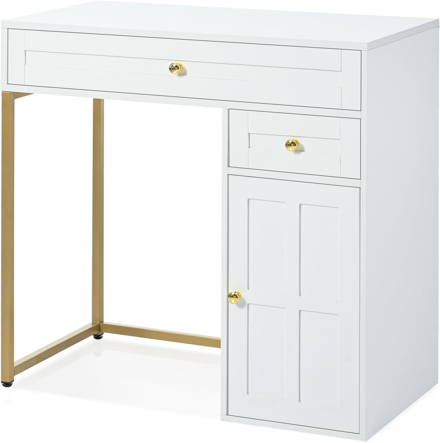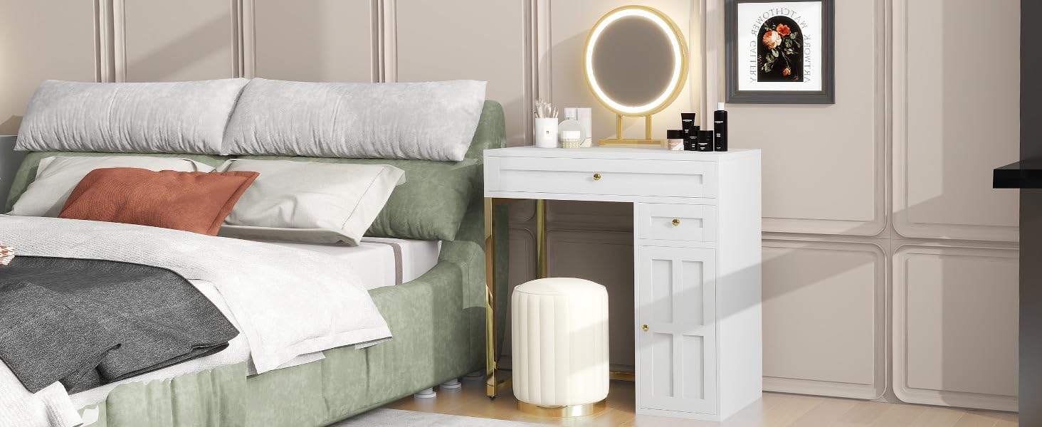 Modern for Every Room your space with this beautifully designed 31.5'' makeup vanity desk. The combination of a round mirror and sleek square tabletop in chic white-gold color scheme makes it addition to any bedroom or study area, integrating various decor styles. Lighting Options routine the innovative equipped three adjustable lighting modes: warm yellow, white, cool white. Easily switch between modes long press adjust brightness, providing perfect occasion—day night.Generous Storage SpaceKeep beauty essentials organized easily accessible. desk features two spacious drawers cabinet an shelf, offering ample storage capacity. Say goodbye enjoy tidier, more functional space.Stable Durable ConstructionThis is built golden iron legs stability strong load-bearing capacity, ensuring its long-term use. MDF tempered glass materials adds desk's overall robustness.Simple AssemblyExperience setup easy-to-follow instruction manual that comes all necessary accessories. Each part conveniently labeled approximately one hour, allowing you new no time.