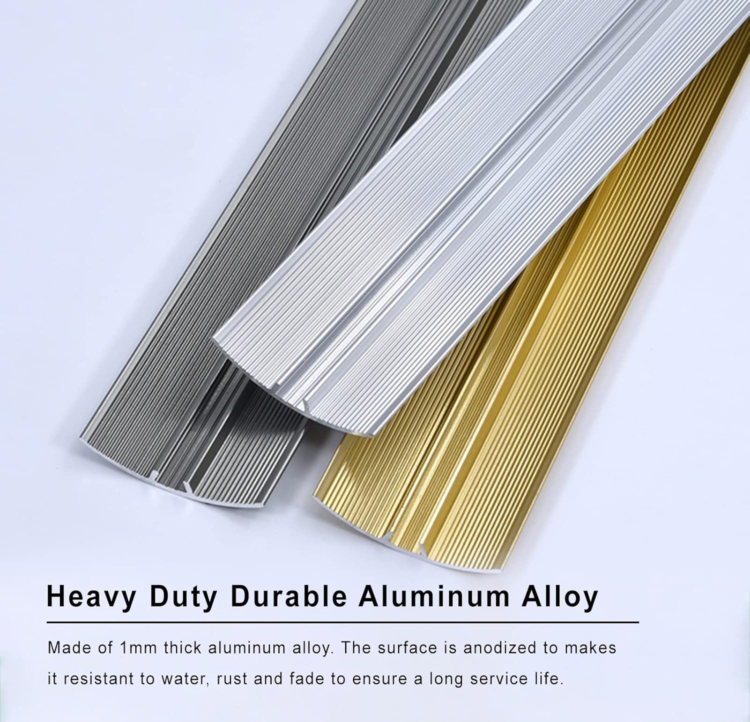 Aluminum alloy transition strips,cover the seams or gaps between two floor surfaces and protect the floor edges and yourself,suitable for flooring,room entrances or other places. Useful for protecting children or the elderly,and not easy to trip over,make your home beautiful and safe. Specifications: - Material: Aluminum alloy - Width: 30mm (1 1 / 8 ") - Height: 5 mm (1/4") - Length: 90 cm (35 3/8 ") - Suitable for cracks less than 2 cm wide - Maximum Load: 250kg / 550lbs - Cuttable Package List: - 1 x 90cm Aluminum Alloy Transition Strip Features: - Aluminum Alloy Floor Transition Strips - No NailsScrews Needed - Easy to clean and not easy to trip over - Edge trimming decoration - Withstands heavy foot traffic Note: - There may be 1-3cm error due to manual measurement. - There may be chromatic aberration due to the difference between the recording lamp and the display. Please refer to the real product.