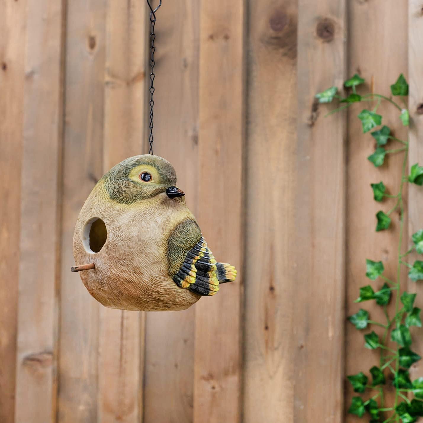 Sold as a single (1) Linnet birdhouse; Made of high-quality resin polymer stone material with eye-catching colors; Birdhouse measures approximately 9.5 x 6.75 x 7.25 inches with an additional 10 inch chain link with hook for easy hanging; Great accent in any outdoor landscaping, patio or porch; Display in your home for a wonderful pop of color; Add fun and interest to your garden with this beautiful hardscape birdhouse while giving your favorite backyard visitors a lovely house!; Ships in protective packaging; Ready for easy gifting.