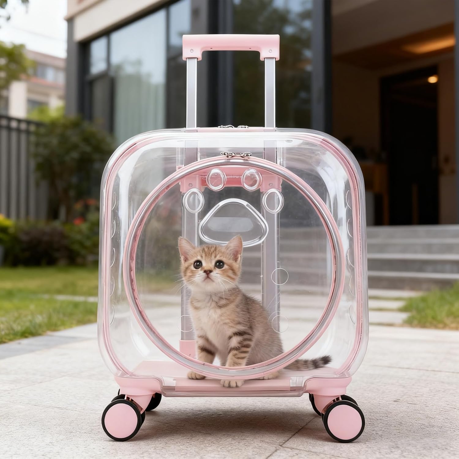 Featuring a trendy transparent space capsule design accented with fresh green trim, this carrier allows your pet to keep visual contact with the surroundings, easing travel anxiety while letting you check on them conveniently. Crafted from high-quality material, it’s both lightweight for effortless carrying and durable enough to resist scratches and minor impacts, with a waterproof surface that adds to its practicalityDesigned with your pet’s comfort in mind, the trolley is equipped with multiple ventilation holes to ensure steady airflow, keeping the interior fresh and cool. The spacious interior comes with a soft, removable mat that provides a cozy resting spot for your pet, and the mat can be easily taken out and cleaned when needed. For versatile use, it functions as both a rolling trolley with smooth wheels and an adjustable telescoping handle, and a hands-free backpack with padded, adjustable shoulder straps—perfect for freeing up your hands during outdoor activitiesConvenient details enhance its usability: side pockets offer storage for pet snacks, toys, and other essentials, while the secure zippered entry allows easy access for your pet. Whether you’re heading to a vet appointment, going for a walk, or embarking on hiking, camping, or travel trips, this multi-functional carrier adapts to your needs. To help your cat get used to it, place items with your scent or their favorite towels inside, and reward them with snacks when they enter actively—making every journey a pleasant experience for both you and your beloved companion.