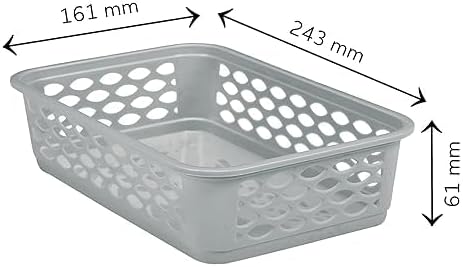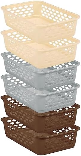 Pack of 6: This set includes six RATAN PLASTICWARE Diana Trays for Storage No. 2 (Narrow), providing ample organizational solutions for your stationary, jewelry, tools, and more. Versatile Design: These desk baskets are designed to fit in narrow spaces, making them ideal for use as cabinet organizers in your bedroom, washroom, kitchen, office, and more. Stylish Colors: The pack includes trays in Lt Brown, Daiso Grey, and Twist Beige, adding a touch of elegance to your space while keeping your items organized.