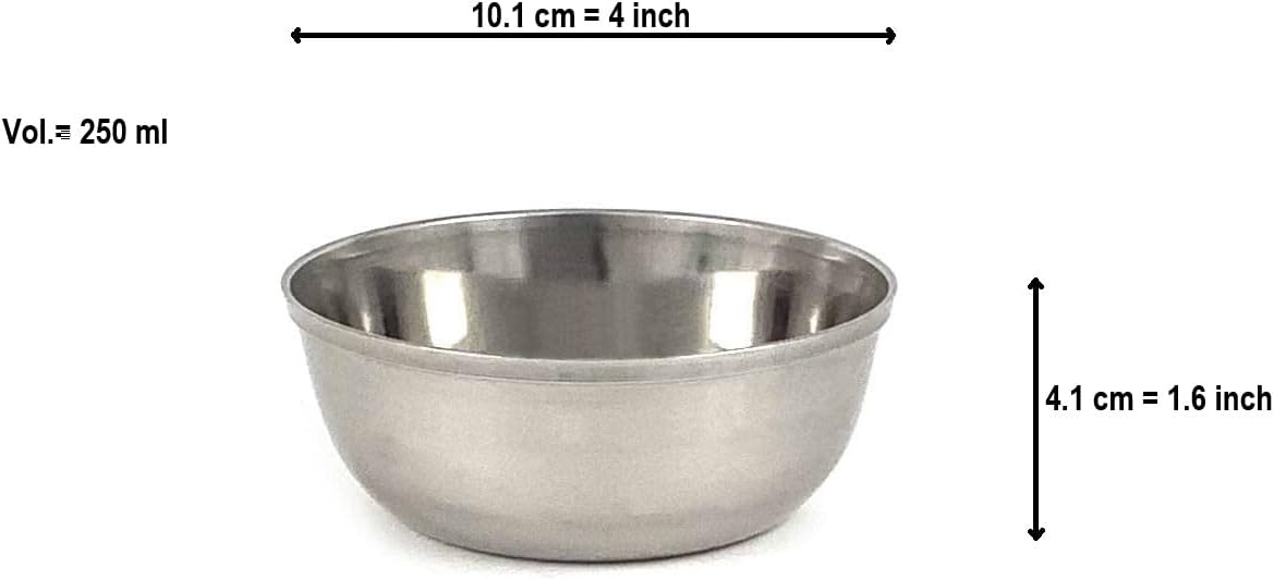 Sauce Bowls For serving perfect condiments & snacks side dishes Finest Quality - Made from Fine thickened stainless steel, polished with a mirror reflection. * Perfect Height-Diameter ratio allows swift and easy dipping, wiping and scooping. Easy-to-Use -> For Quick, Easy food dipping & serving. -> Ideal for serving Sauce, Dips, Jam, Tuna, Egg-Salad, Guacamole, Parmesan, Snacks, Candy, Olives, Seeds, Peanuts, Pistachios, Ground Powder, Spices, etc. -> A Smooth & Perfect use every time! -> Super Comfortable to use!! -> Easily cleaned - Dishwasher safe. -> Strong and durable for lifetime. Diameter x Height: 10.1 x 4.1 cm / 4 x 1.6 inch Capacity: 250 ml