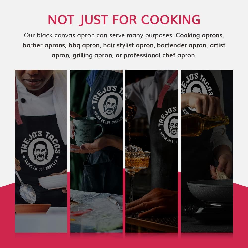 Trejo’s Tacos Black Canvas Chef’s Cooking Apron for Men and Women Do you want to look like a badass while cooking your favorite barbeque or Treojo’s tacos recipe? Get yourself a Trejo’s Tacos Heavy-Duty Black Canvas Chef’s Apron! Beautifully designed cooking apron with adjustable straps that features the Trejo’s Tacos logo on the front. Durable Black Canvas Crafted from 100% durable cotton that can withstand the heat in the kitchen. Great for professional chefs or casual home cooks who love to fire up the grill. Sturdy, comfortable, and stylish in one. Adjustable neck strap Find the perfect fit with your apron by using the adjustable neck strap. Simply pull the strap to your desired height and you are ready to cook! Suitable for men and women of all shapes and sizes. Protect your clothes The thick canvas materials help keep your clothes underneath the apron clean, dry, and protected. Don’t worry about soiling your clothing while rocking the Trejo’s Tacos apron. Professional quality apron Whether you are a professional chef or home cook, the Trejo’s Tacos black cooking apron is designed to withstand intense cooking or grilling. Your friends will know you mean business and that something delicious is in the works when you throw on this apron. Not just for cooking Our black canvas apron can serve many purposes: Cooking aprons, barber aprons, bbq apron, hair stylist apron, bartender apron, artist apron, grilling apron, or professional chef apron