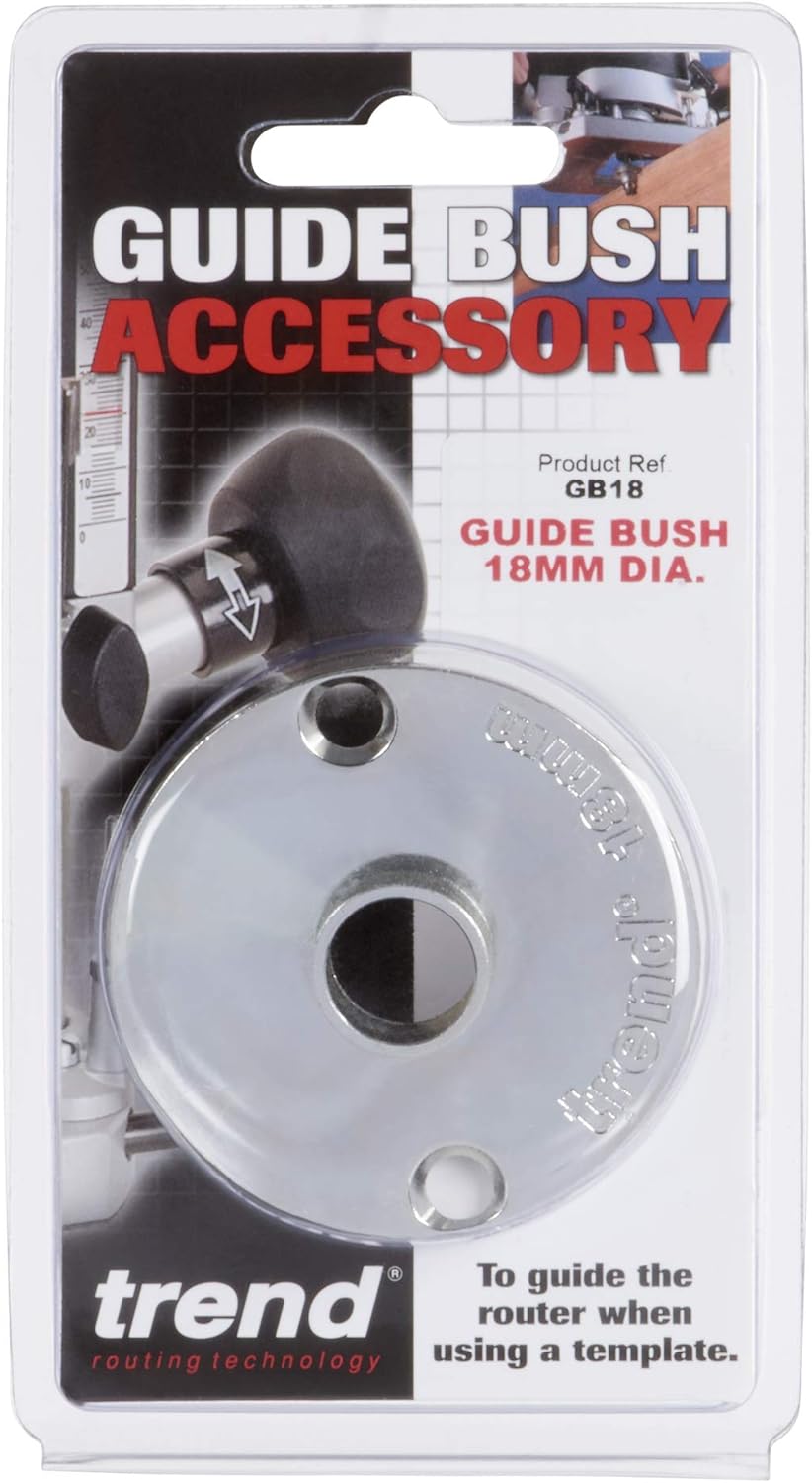 18MM GUIDE BUSH: The Trend GB18 offers a 18mm outside diameter and 15mm inner diameter for precise template routing. Perfect for projects requiring precision and stability.QUALITY CONSTRUCTION: Made of robust, durable steel, ensuring longevity and consistent performance. Provides a sturdy 6mm spigot, suitable for a wide range of routing applications.EURO STYLE GUIDES: Compatible with the Euro Style Guide system, this guide bush is adaptable for international woodworking standards. Providing seamless integration with your existing router setup.TEMPLATE TOPHAT FEATURE: Ideal for template tophat routing, this 18mm guide bush helps maintain accuracy while maximizing the versatility of your router.WIDE COMPATIBILITY: Designed to fit directly to Trend T3, T4, T5, T5 MK2, T9, T10, and T11 routers. Also compatible with other light-duty routers when used with GB/5, GB/PLATE, or UNIBASE Sub-Base.