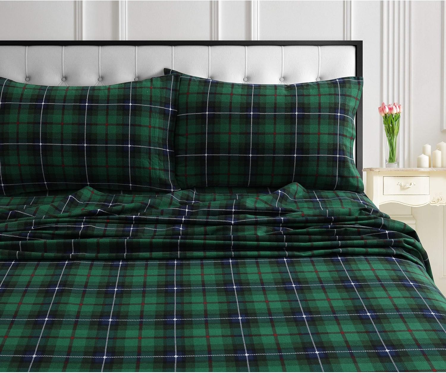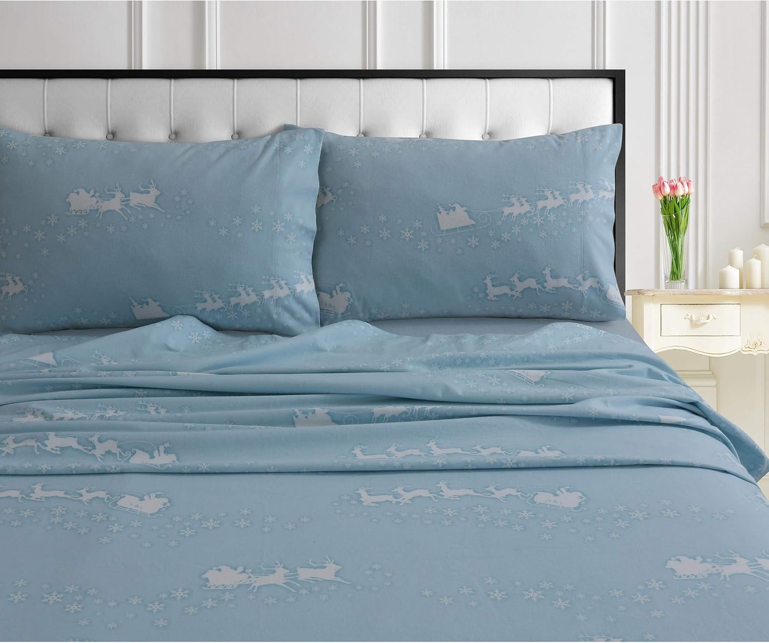 Available in a palette of solids and holiday and traditional printed patterns, these buttery soft, cozy sheets are made of 170gsm 100 percent cotton flannel and are a must have for master, guest and kids bedroom. Brushed on both sides for ultra-soft hand and sanforized to minimize shrinkage, this sheet set is designed to accomodate most pillowtop and extra deep mattresses with its wider flat sheet and fully-elasticized extra deep fitted sheet. Set includes one king flat sheet, one king fitted sheet and two king pillowcases. Machine washable.
