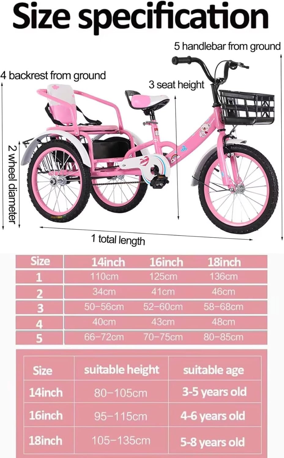 Specification: Name: rickshaw tricycle Suitable user: toddlers (3-11) Maximum load: 120 kg. Package:1 x Disassembled Tricycle (must assemble it yourself) Material: 1. High carbon steel frame 2. PU leather wrapped sponge seat 3. Rubber grip 4. Spoked Aluminum Alloy Wheel 5. Butyl rubber inner tube + non-slip rubber outer tire 6. PVC Pedals Size: 14 inches: total length 110 cm, distance between handlebar and floor 66-72 cm, distance between saddle and floor 50-56 cm, suitable for children aged 3-5 years, child body height 80-105 cm; 16 inches: total length 125 cm, distance between handlebar and floor 70-75 cm, distance between saddle and floor 52-60 cm, suitable for children aged 4-6 years, child body height 95-115 cm; 18 inches - total length 136 cm, handlebar from the floor 80-85 cm, saddle from the ground 58-68 cm, suitable for children aged 5-8 years, suitable body height 105-135 cm; Features: 1. Pedal tricycle is mainly used for hanging out, shopping, traveling or daily exercise. 2. Single brake on the front wheel. 3. Front and rear basket, along with a storage compartment at the bottom of the back seat, which can be used to carry daily necessities.