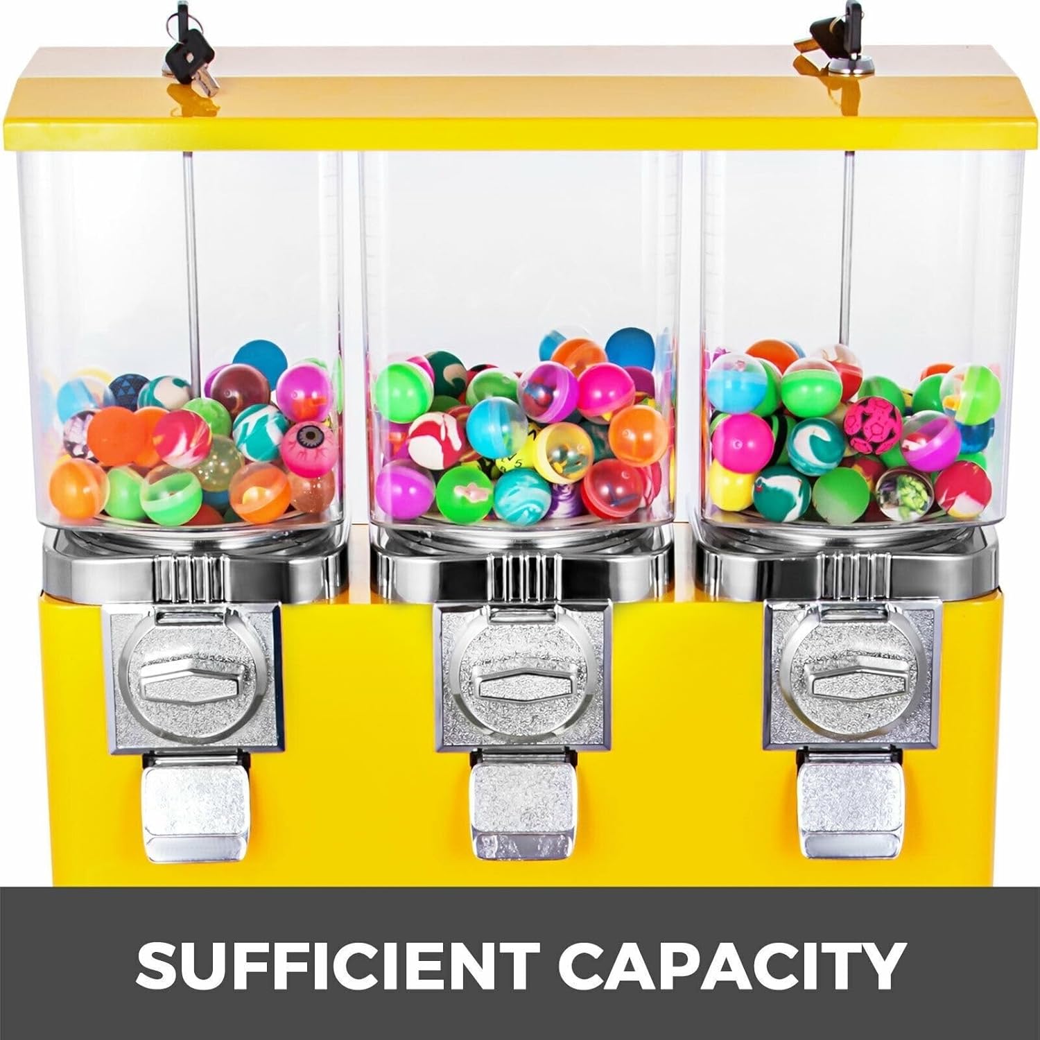 SpecificationsCapacity: 350pcs gumballs(1 inch diamater)/8-10 lbs of candy each tankCompartment Quantity: 3 Type:Candy Gumball MachineLock & Key 3 locks 6 keysCoin Adaption 25cent coinGross Weight 43 lb 195 kgPackage Dimensions L x W x H 217" x 20 x 16.5" (55 x 51 x 42 cm)Package Content1 x Candy Gumball Vending Machine6 x KeysYellow Candy Vending Machine DispenserSuperior a triple pod candy gumball machine available for 350 gumballs, bouncy balls or 1" round capsules, 8-10 lbs of candyfor each tank. With the interchangeable pod system, it is quite quick and easy to refill.Suitable for both free standing and countertop usage.Large CapacityConvenient UsageAdditional ProtectionBetter Quality and StabilitySpecificationsCapacity: 350pcs gumballs(1 inch diamater)/8-10 lbs of candy each tankCompartment Quantity: 3 Type:Candy Gumball MachineLock & Key 3 locks 6 keysCoin Adaption 25cent coinGross Weight 412 lb 187 kgPackage Dimensions L x W x H 21" x 20" x 16.5" (53 x 50 x 42 cm)Package Content1 x Candy Gumball Vending Machine6 x Keys