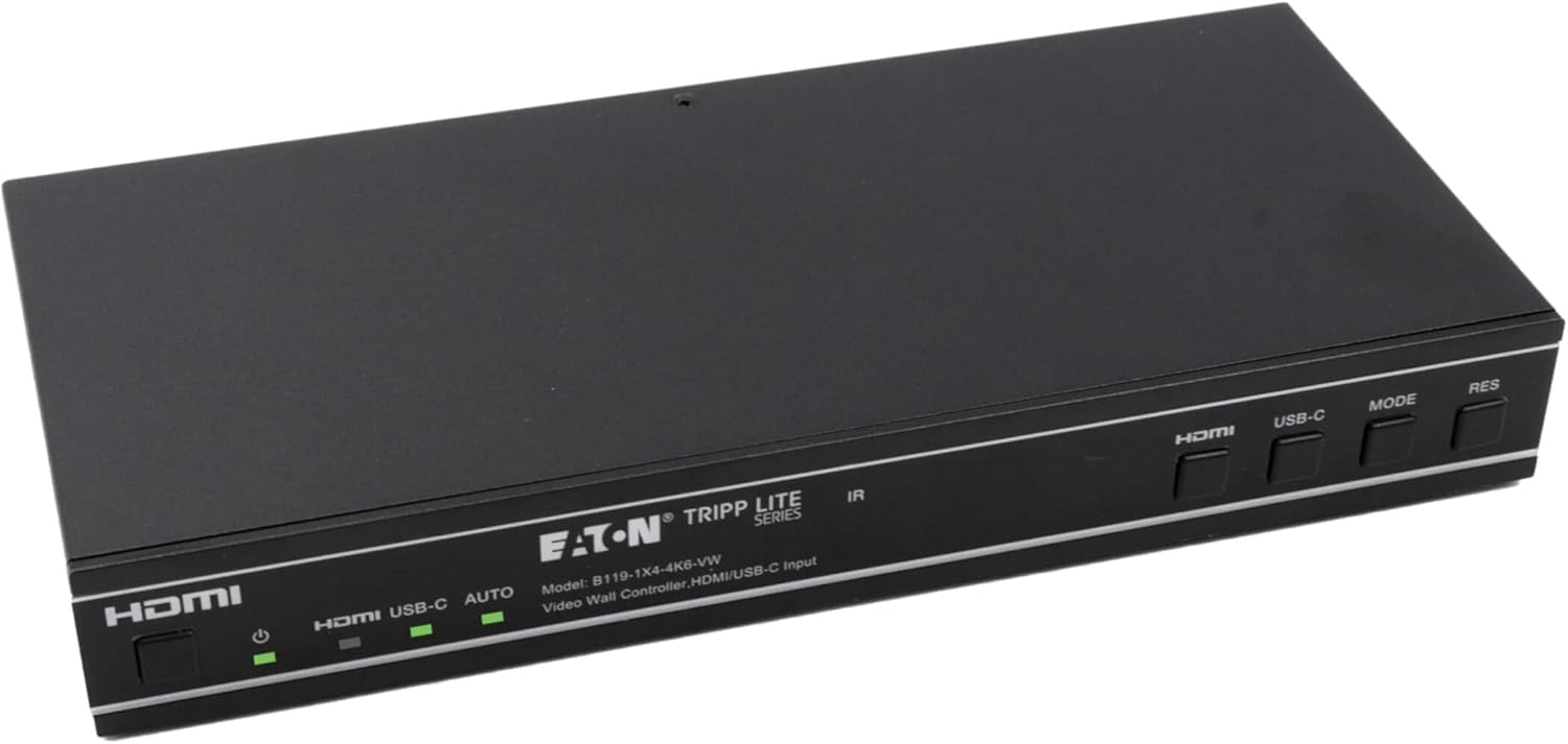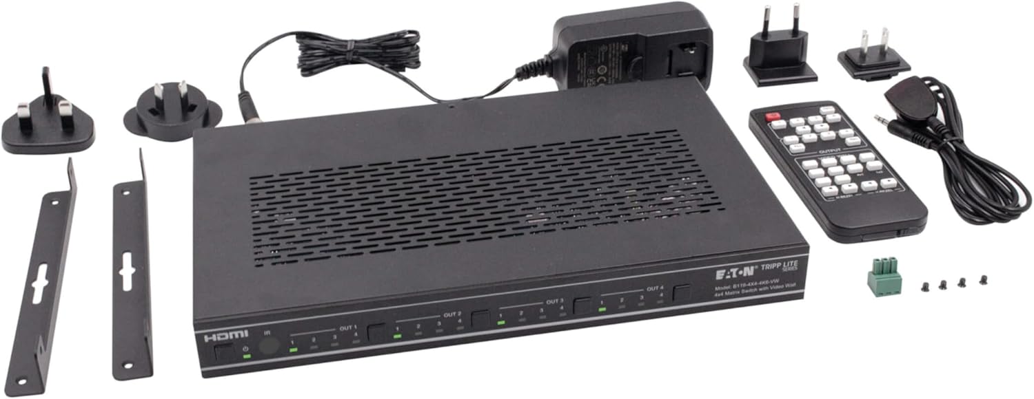 Extends 4K Video in 2 Operational Modes: 4x4 Matrix and Video Wall This Matrix Switch is a multi-purpose high-speed video processing system that you can configure for two different output modes: 4x4 matrix (with seamless switching) and video wall. It features four HDMI inputs with resolution up to 4K at 60 Hz and four HDMI outputs to create 10 video wall modes: 2x2, 1x2-2, 1x2, 2x1-2, 2x1, 1x3, 1x4, 3x1, and 4x1. You can set display modes via front-panel buttons, the included IR remote, RS-232 commands or TCP/IP. Access the web GUI to visualize content shared over multiple displays. Transmits 4K Video with HDR and 4:4:4 Color The B119-4X4-4K6-VW supports Ultra HD 4K resolutions at 60 Hz with LPCM, Dolby Digital/Plus/EX and DTS audio. It supports HDR (High Dynamic Range), providing a wide range of vibrant colors with richer contrast, brighter whites and deeper blacks that pop on your 4K display. HDCP 2.2 encryption allows you to stream 4K content with no loss in resolution. This switch also supports uncompressed 4:4:4 chroma subsampling for top-level PC gaming or using your HDTV as a PC monitor. Multi-Resolution Support Allows Mixing and Matching of Displays of Different Resolutions Say you have a brand new 4K/60 Hz HDTV in the living room, but want to also connect your Blu-ray player or media server to the older 1080p TV in the kitchen and the 4K/30 Hz monitor in your home office. The B119-4X4-4K6-VW is backward compatible with 4K/30 Hz and 1080p resolutions via automatic switching, allowing each connected television to display video at its maximum resolution without affecting the other outputs. Plug-and-Play Operation for Quick Setup and Immediate Use The unit works right out of the box with no software required. Mounting hardware is included for installing the units on a wall, under a desk or in a 19-inch rack. Connect up to four 4K source devices to the HDMI inputs and up to four 4K displays to the HDMI outputs with user-supplied cables. The external power supply comes with four international plug adapters to ensure an AC connection anywhere.