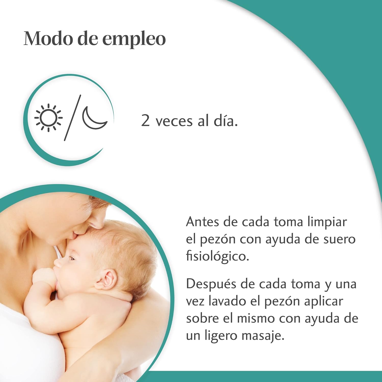 INDICATIONS: Protects nipple skin preventing the appereance of cracks, especially during pregnancy and breastfeeding. WAY OF USE: Apply twice a day in the nipple area with a light massage. During pregnancy, after each take and once the nipple is cleaned, apply over it with a light massage. Hipoallergenic.