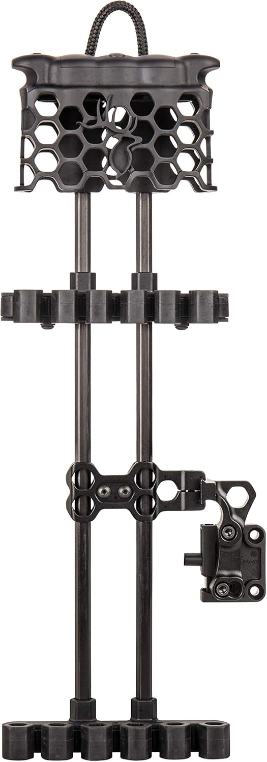 Illuminate the hunt with the all-new Hex Light arrow quiver. The all-new Hex Light Arrow Quiver features four glowing green LED lights – three on top of the hood and one inside. The Hex Light quiver holds five arrows using adjustable single or dual arrow grippers, while the precision-designed soft-touch hood of the quiver can accommodate fixed or mechanical broadheads without risk of deploying. Shine brighter with the Trophy Ridge Hex Light Quiver.