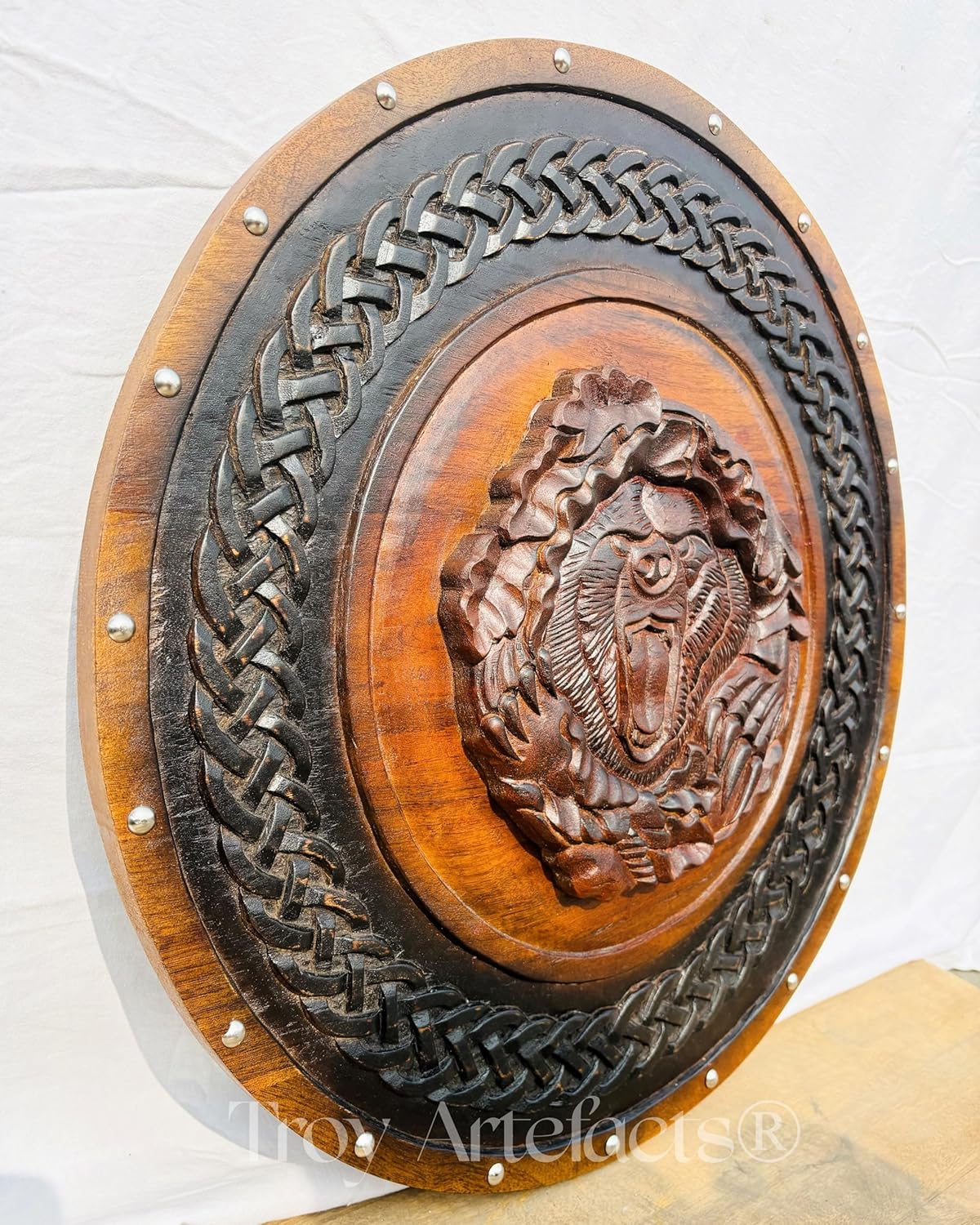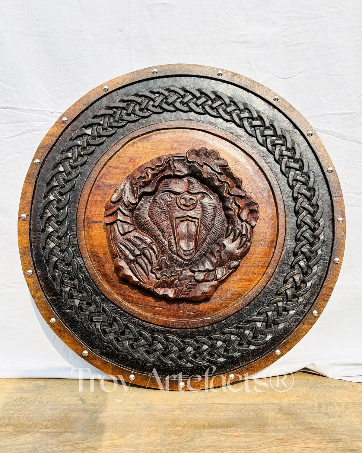 ⚔️ Unleash the Berserker Spirit with This Handcrafted Viking Shield! ⚔️Step into Norse legend with the Troy Artefacts Handmade Viking Shield, featuring a striking carved Berserker Bear Totem. Crafted from premium pine wood, this shield embodies strength, courage, and warrior spirit.Perfect for SCA battles, LARP, cosplay, and home décor, this shield is built to impress. The battle-worn antique finish and intricate hand-carving add an authentic touch, making it ideal for collectors and Viking enthusiasts.🎁 A Unique Gift for Him – Surprise your husband, father, or boyfriend with a piece of Viking history. Whether for display or reenactments, this shield is a statement of power and heritage.🔥 Embrace the Viking legacy – Own a warrior’s shield today! ⚔️🐻