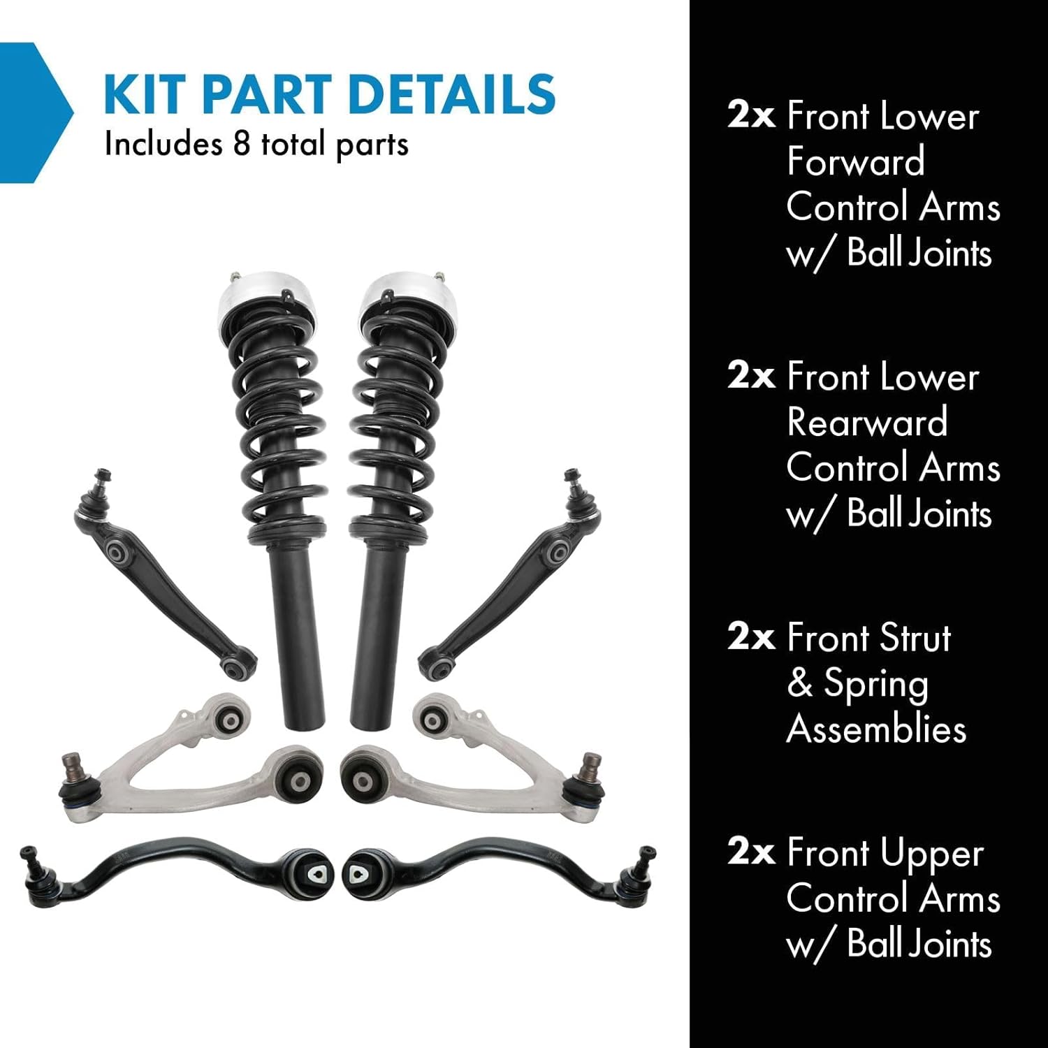 8 Piece Suspension KitKit Includes(2) Front Lower Forward Control Arms with Ball Joints(2) Front Lower Rearward Control Arms with Ball Joints(2) Front Strut & Spring Assemblies(2) Front Upper Control Arms with Ball JointsFitmentBMW X5 2007-13 - without Sport Suspension Front without Adaptive Drive SuspensionBMW X6 2008-14 - Front without Adaptive Drive SuspensionProduct AttributesQuantity: 8 PieceProduct Features Application Specific Design: No modifications necessary Anti-Corrosion Coated: Enhanced surface life Pre-greased: No additional maintenance required Kitted for Restored Performance: Improved road-feel and handlingItem DetailsTRQ suspension kits are manufactured using premium raw materials and coatings for extended service life. Each TRQ suspension component is designed to be a direct, maintenance-free replacement to the stock unit. To extend the life of your steering and suspension components, TRQ recommends replacing components in pairs, sets, or kits. All products are fit and road-tested in our Massachusetts R&D facility to ensure we deliver on our promise of Trusted Reliable Quality.Reference Numbers101-6798101-6799101-7038101-7039102-7502102-7503114251142615020231502024150202515020261502027150202826064142606415260658126065822606583260658426070512607052260822526082262CB102342CB102353112677189331126771894311267739493112677395031126776417311267764183112678898131126788982311268637853112686378645D1008845D124245D124345D19204CB102044CB102094CB501964CB50197511-50147R511-50148L512-50279R512-50280R512-50281L512-50282L521-161521-162521-163521-164521-515521-516623.3403295-99560-195-99560-295-99561-195-99561-296-99576-196-99576-2CA1466BCA1471BCA1500BCA1501BCA1673BCA1674BCB10204CB10209CB10234CB10235CB14027CB14027PRCB14028CB14028PRCB14353CB14353PRCB14354CB14354PRCB14363CB14363PRCB14364CB14364PRCB50196CB50197CMS101057CMS101058CMS101083CMS101084CMS101143CMS101144CMS101433CMS101434FA3408FA3409FA3410FA3570FA3571FA3572FA3573GS101057GS101058GS101083GS101084GS101143GS101144JTC1455JTC1456MS101057MS101058MS101083MS101084MS101143MS101144RK620798RK620799RK620800RK620801RK620975RK620976SUS05149SUS05150SUS05724SUS05725SUS05726SUS05727TC2227TC2228TC2229TC2230TC2328TC2329