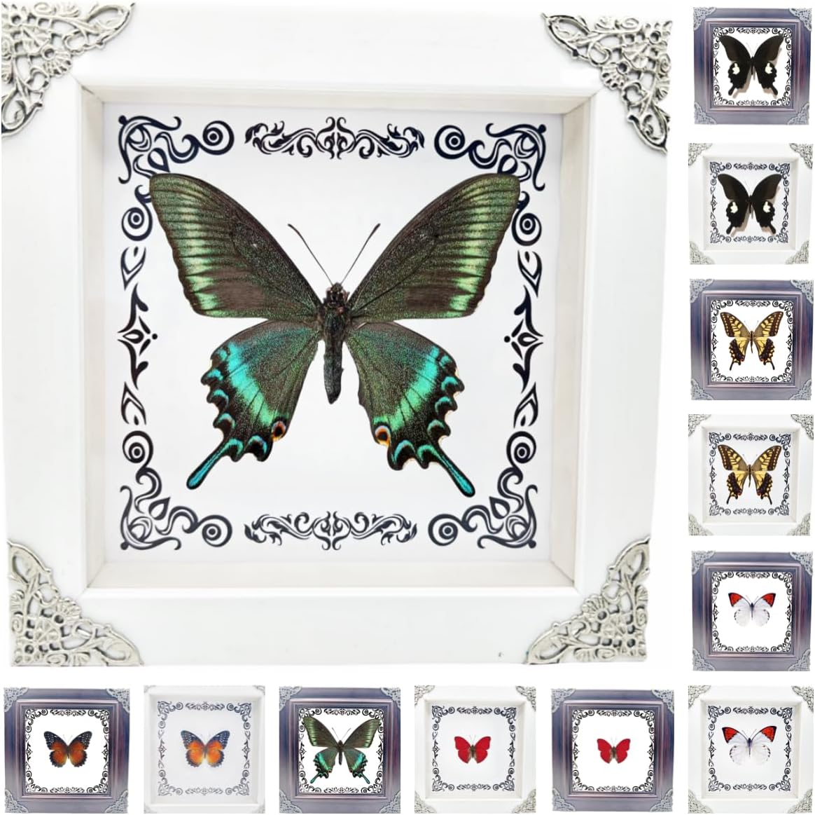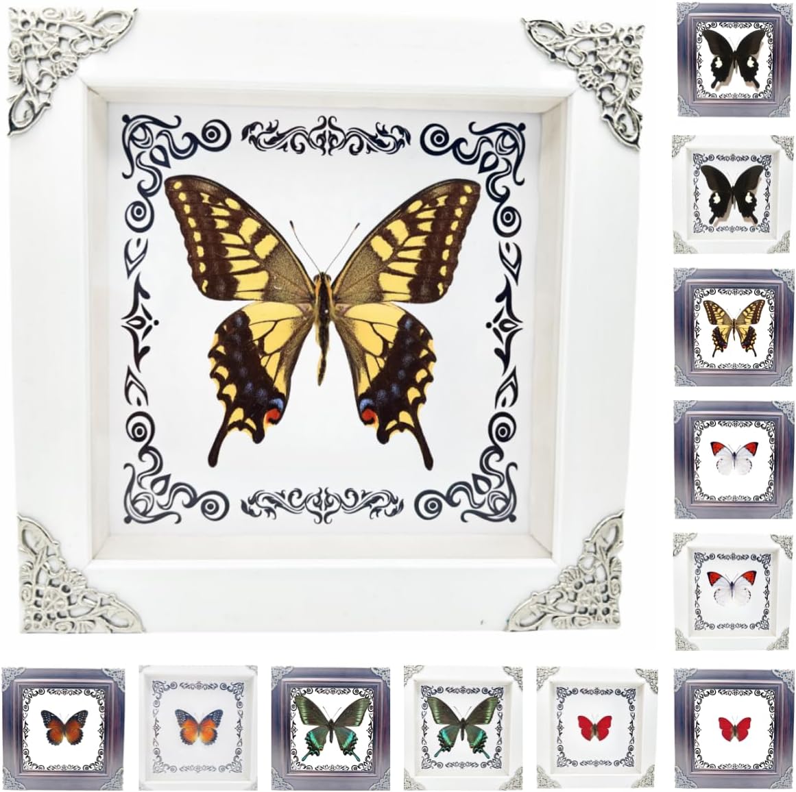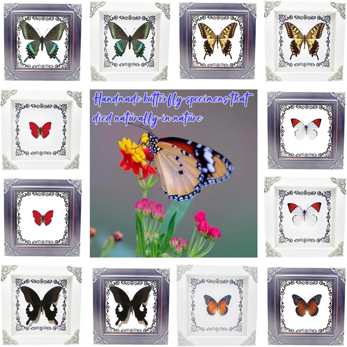 The butterflies that died naturally have been carefully and completely preserved by our insect researchers, so that you can observe them better. The photo frame is made of high-density wood that is not easy to damage. The size is 7.08x7.08x1.37 inches. The high-quality plexiglass allows you to observe the butterflies more clearly. There is a support tripod on the back, which can be placed on any flat place. There is a detachable rotating button on the back, which you can open to satisfy your curiosity. Each specimen is real and unique from nature. The size, pattern, and color will all have slight deviations. This is a very beautiful gift for people of all ages. It shows the charm of art and nature very well. It is also very suitable for your family, friends, neighbors, animal specimen making, biology or quirks enthusiasts, insect enthusiasts, and can be placed in classrooms, living rooms, offices, birthdays and other places. Because the insect specimens are very fragile, if the product you received is damaged during transportation, please contact us by email and we will exchange or refund you.