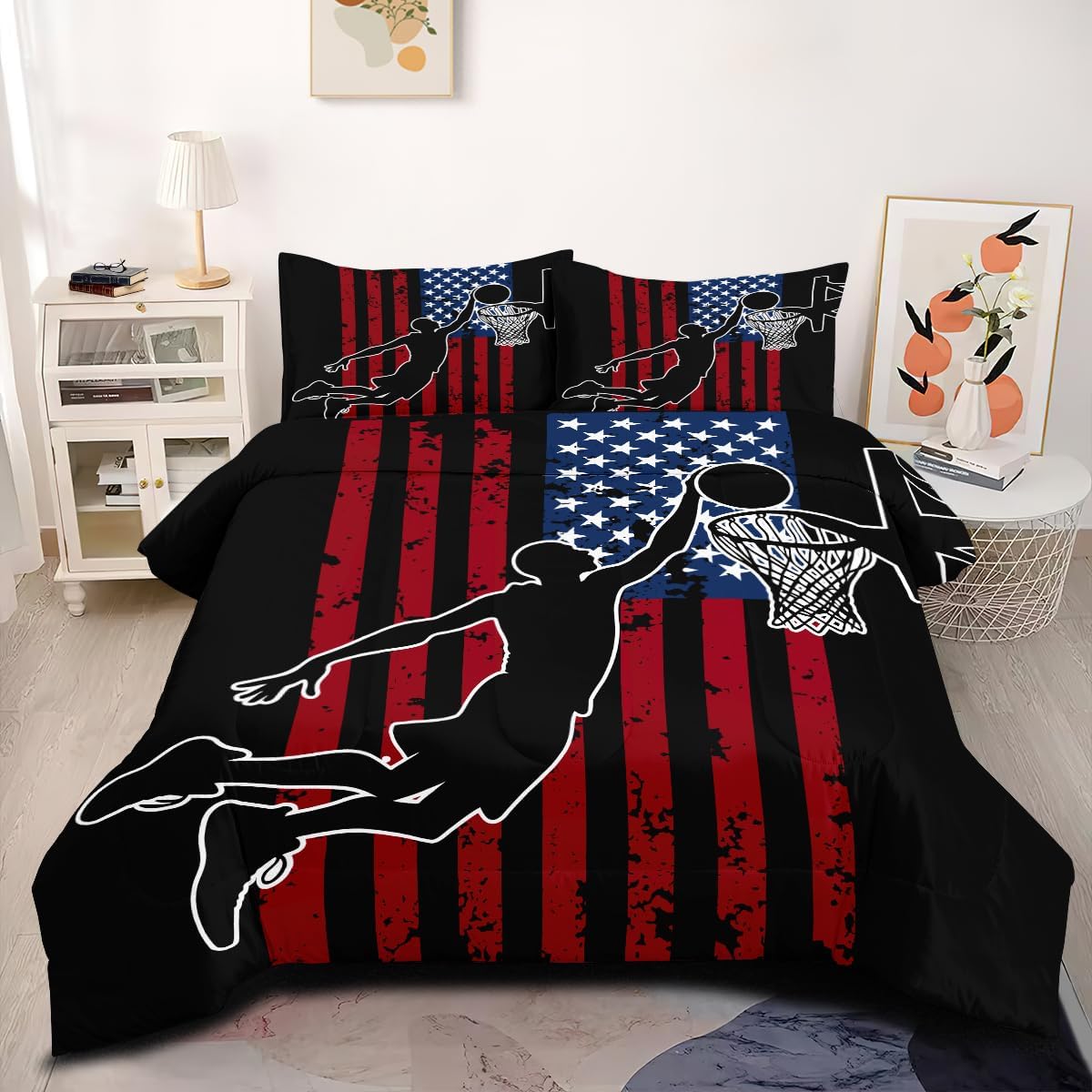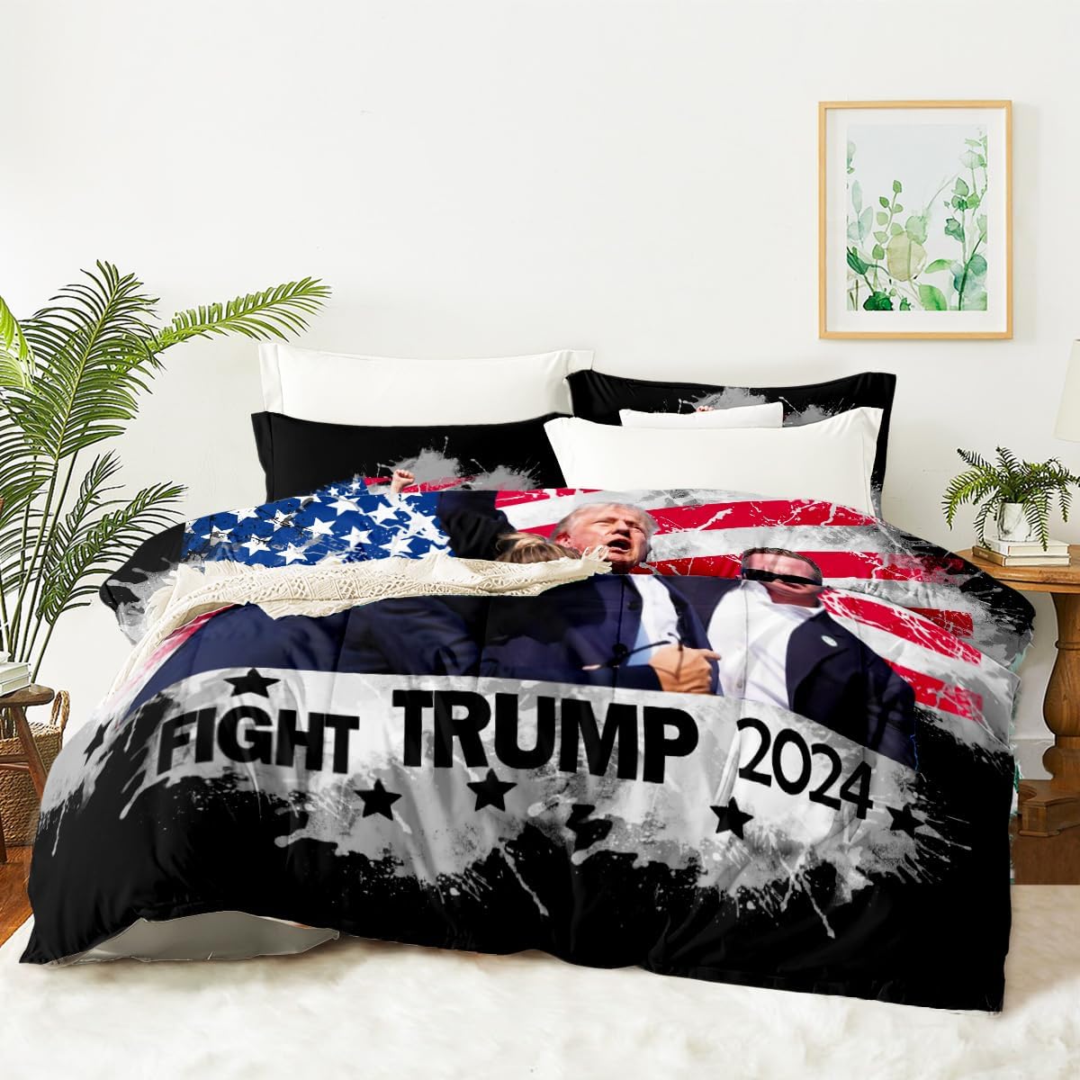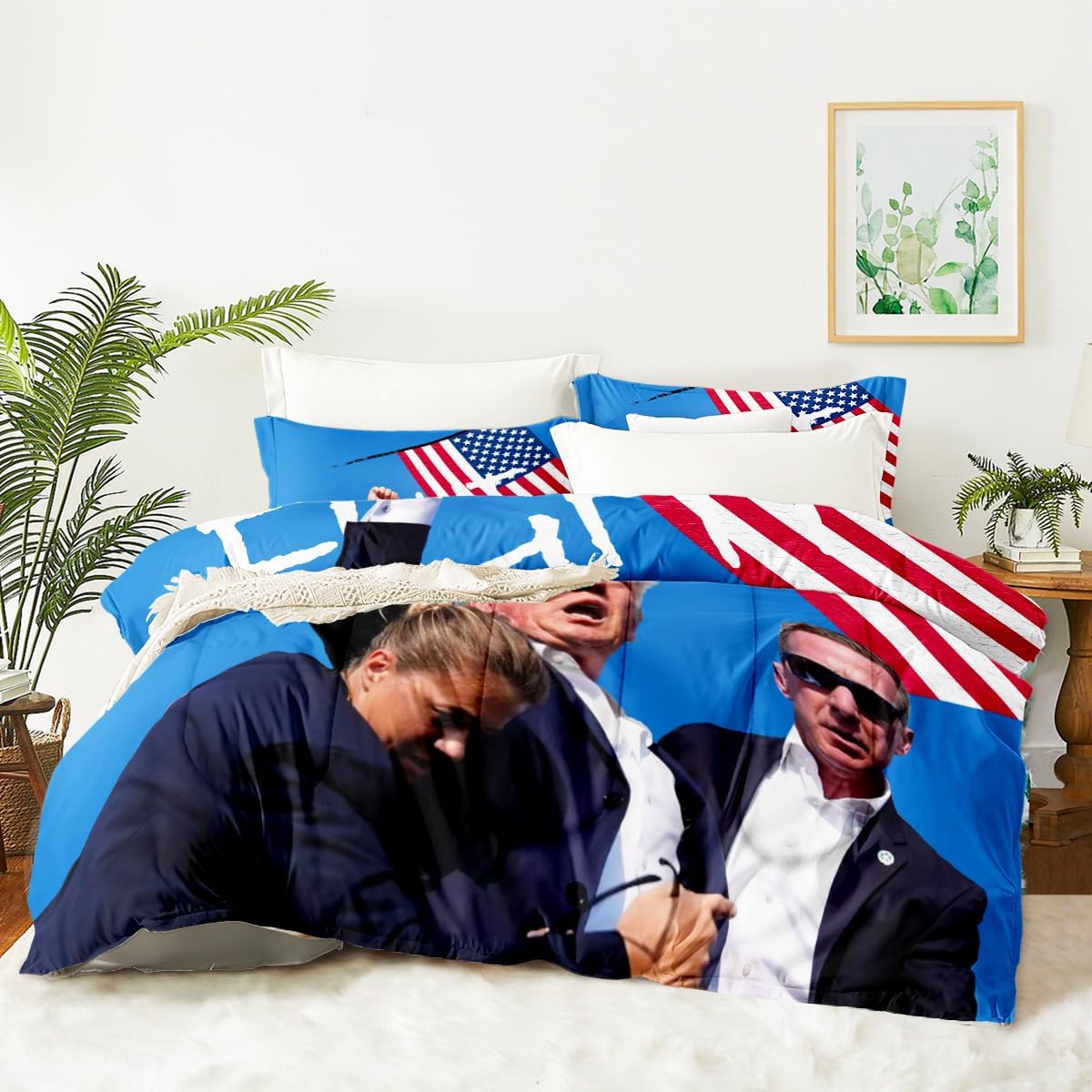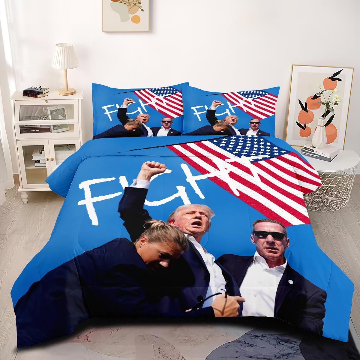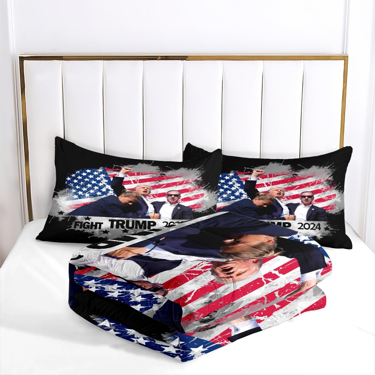 [Material Selection] This Trump Flag comforter set queen size is made from super soft microfiber and filled with 250g imported fiberfill. It’s lightweight, breathable, and soft, ensuring you won’t feel stuffy or sweaty during summer or winter. This Trump Flag comforter set can adjust your body temperature, providing more comfort and improving your sleep quality. [The Design] Our Trump Flag bedding set use the latest 3D printing technology to create crisp, colorfast patterns that won’t fade, using safe odorless dyes. The U-shape stitching ensures the microfiber filler is sewn tightly to prevent clumping or shifting. With a wide range of colors and styles to choose from, these unique patterns are suitable for all types of interior decor, including vintage, modern, farmhouse, ethnic, sports, romantic, and more. Perfect gifts for children and teens during holidays, New Year, Valentine’s Day, and Christmas. [Size] full Size: Trump 2024 Flag comforter (79" x 90"), 2 pillowcase (20" x 30"). king Size: Trump 2024 Flag comforter (90" x 104"), 2 pillowcases (20" x 36"). queen Size: Trump 2024 Flag comforter (90" x 90"), 2 pillowcases (20" x 30"). twin Size: Trump 2024 Flag comforter (68" x 86"), 1 pillowcases (20" x 30"). Tips The Trump Flag comforter set queen size are only printed on the front; the back is soild. [Cleaning Method] Our Trump 2024 Flag bedding set for girls is machine washable, saving you time and energy. Wash gently in cold water and tumble dry at low temperature. Do not bleach. [Satisfaction Service] We are committed to providing high-quality, comfortable and beautiful bedding set so that everyone can enjoy a quality sleep in their bedroom at home. We offer exchange service. If you encounter any issues, please contact us promptly. We will process your request as soon as possible within 24 hours.