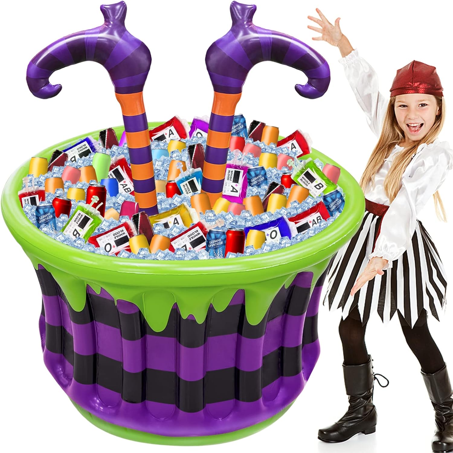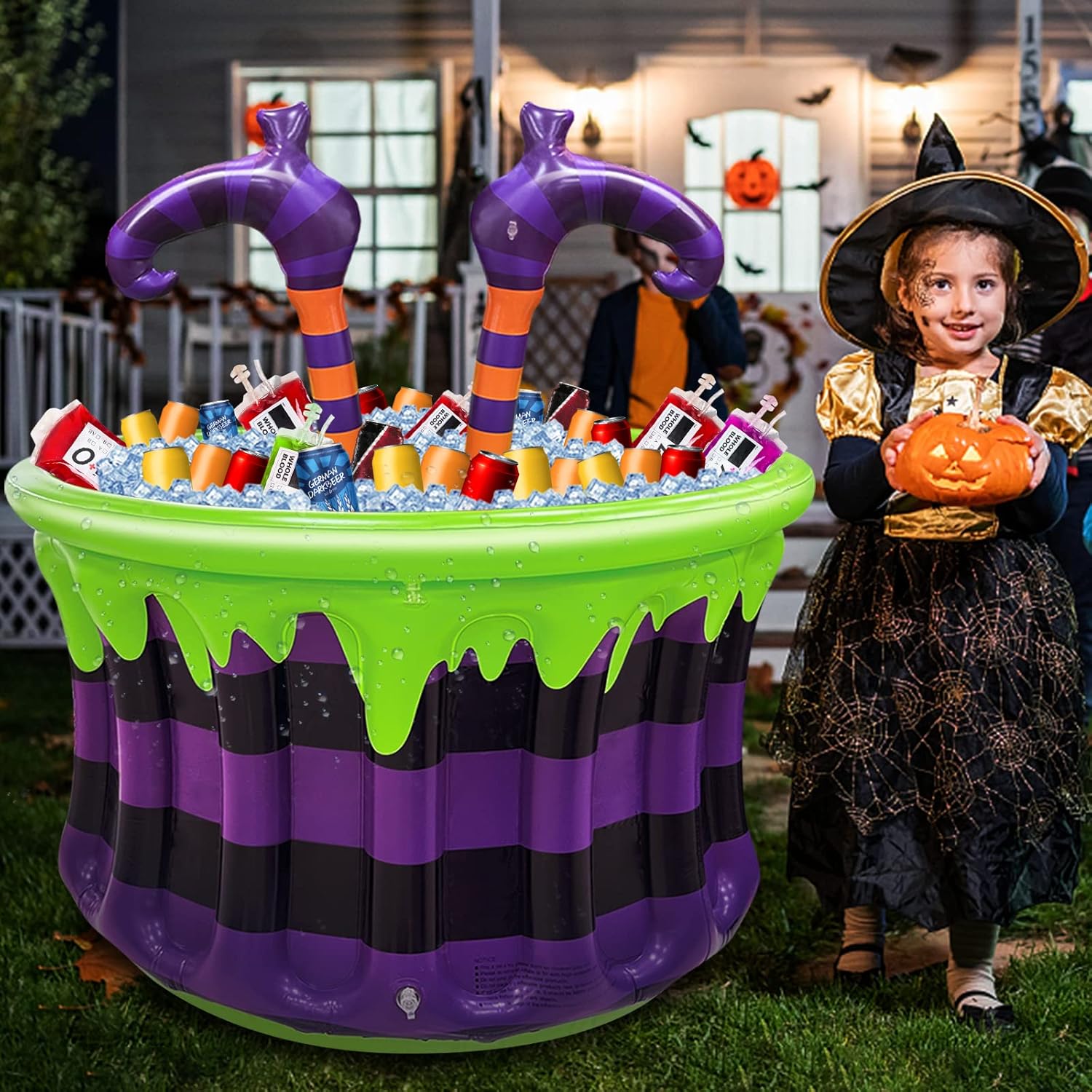 Specifications size: Overall size: 40*35 inch (height*width) Cooler: 24*35 inch (H*W) Product color: green + purple Product appearance: witch cauldron legs Material: PVC Capacity: 200+ cans PVC Thickness: 0.23 mm Applicable scene: Halloween theme party, Halloween party decoration, birthday party, pool party, pool party decoration, backyard barbecue, outdoor camping,etc. Package Includes: 1 x Halloween Inflatable Witch cauldron Legs Cooler