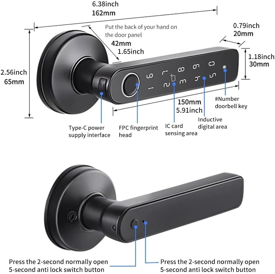 smart door lockPower Supply : DRY BATTERYInstallation Method : Drilling installationSuitable Door Type : Wooden DoorSpecial Features : Support GatewayDoorknob Funcition : Biometric,Key & KeypadConnectivity : BluetoothWays To Unlock : App,Bluetooth,Mechanical Keys,Card,PasswordHandle Direction : Direction ReversibleModel Number : Q50-tuyaPower Source : DRY BATTERYSmart home platform : TuyaPower supply mode : 4 AAA Alkali-saving dry cellMaterial : ABS plastic panel, stainless steel lock corevoltage : 4.8VVoltage range : 4.5-9VLock-picking time : x1.5 sOperating temperature range : -20-70Other dynamic passwords : 100Waterproof Grade : Compliant with IP65 standard