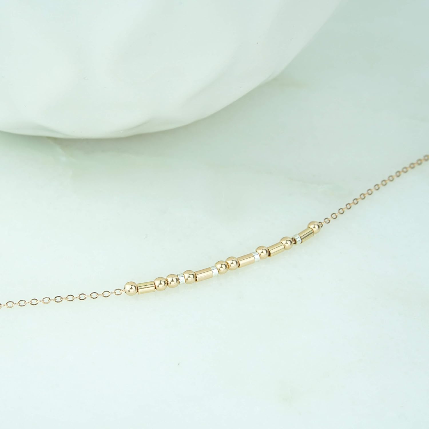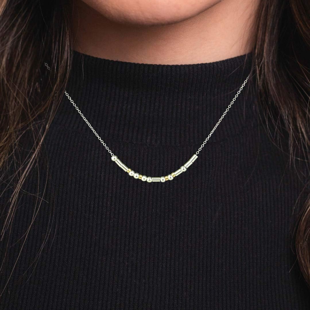 Morse code necklace would make a perfect gift for yourself or your loved ones. This beautiful necklace is the perfect layering necklace or beautiful on its own. ITEM SPECIFICATION: Chain: Dainty Charm Size: 2.5 mm beads, 2 x 3 mm tubes Material: Gold dipped, Silver dipped, Rose gold dipped