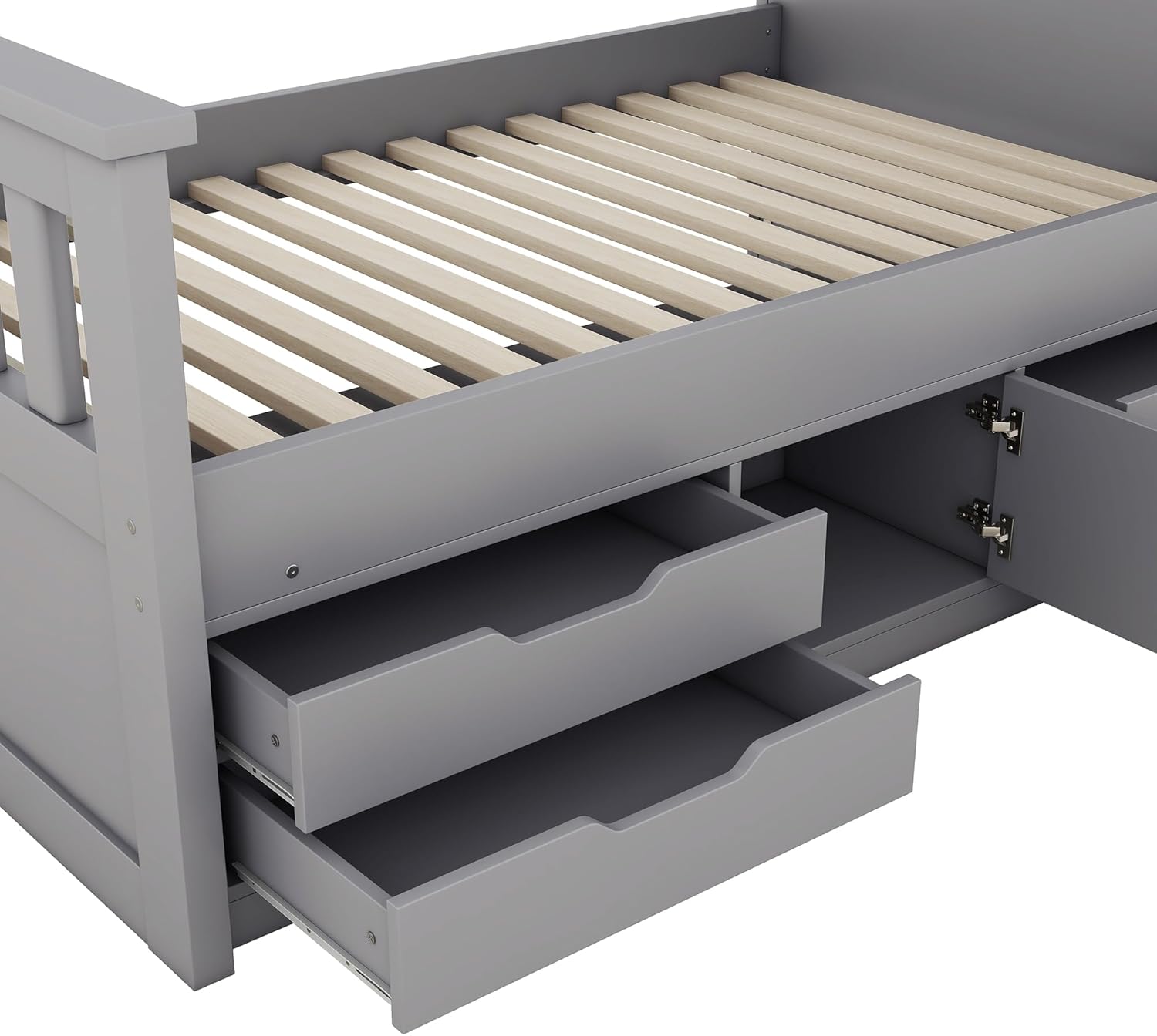 Description Material:Pine wood+MDF Size:Twin Color:Gray/White Numbers of Package:3 Spring Box:No need Assembly Required:Yes Overall Product Dimension:85''L x 42.9''W x 48''H Bed Dimension:76.1'' x 39.4'' Total Height:48'' Recommend Mattress Thickness of Bed:6-8'' Overall Product Weight:215.5lb Bed Weight Capacity:660lb Notes:Manual measurement has been used,there may be some reasonable error. All the pictures are taken by actual samples, slight chromatic aberration may occur due to lighting or display.