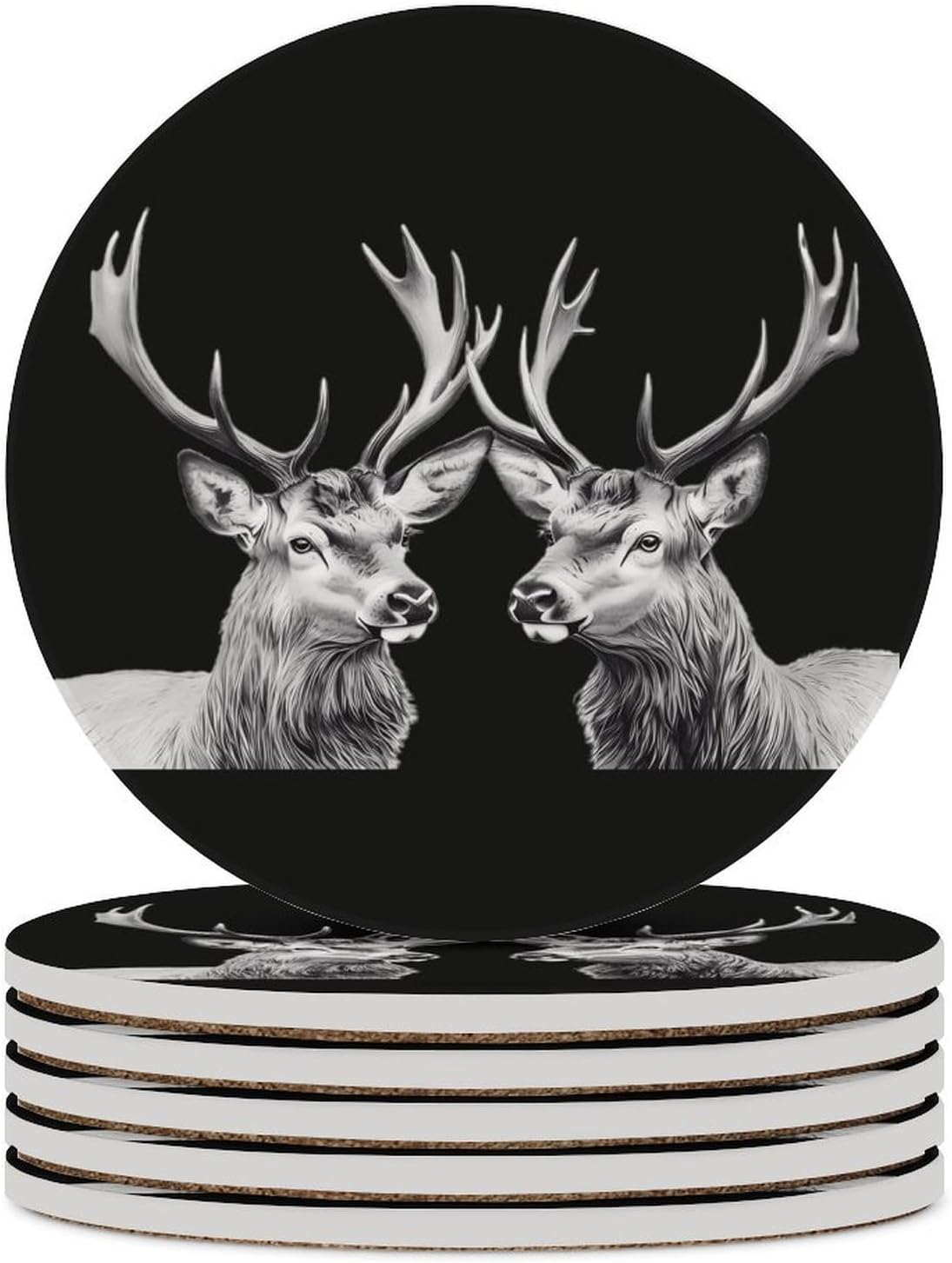 Two Deers Round Ceramic Coasters for Drinks Absorbent Cup Holder Tabletop Protector with Cork Base