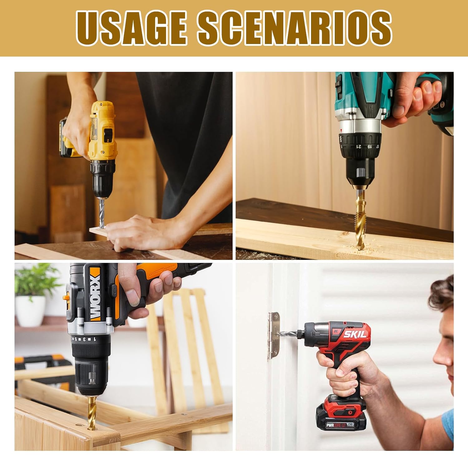 Specifications Product name: two 6-piece drill and cutter sets; Colour: gold and silver. Dimensions: M3 x 0.5 / M4 x 0.7 / M5 x 0.8 / M6 x 1.0 / M8 x 1.25 / M10 x 1.5; weight: 75 g per set. The two 6-piece sets are made of high-quality HSS steel with titanium surface coating, which ensures sharp cutting edges and excellent stability. The Gew inde schneider set combines drilling and cutting functions, so no constant tool changes are required, which saves time and effort in DIY and professional use. The metal drill set is therefore an indispensable tool for precise work. The drill with hex shank ensures a firm connection with standard devices such as cordless screwdrivers, drills and impact drivers, avoids slipping and ensures safe handling. The Gew inde drill set includes all standard metric sizes from M3 to M10, each size is clearly marked for quick identification and selection. The set is specially optimised for metal, but also fits perfectly with plastic, wood and light metal. The precise cutting edges of the drill metal ensure clean holes and smooth gew without causing material wear. In addition, each set comes in a compact storage box that keeps order and prevents loss, perfect for the drill set during storage and transport. The two 6-piece equipment is enough for multiple applications or as a replacement, ideal for DIY enthusiasts, craftsmen and hobbyists. Der Maschinengew inde bohrer mit Titanbeschichtung ist leicht zu lagern und transportieren, während das Gew inde schneider für hohe Praktikabilität in täglichen Repa rat uren, Montagen und Werkstattarbeiten steht.