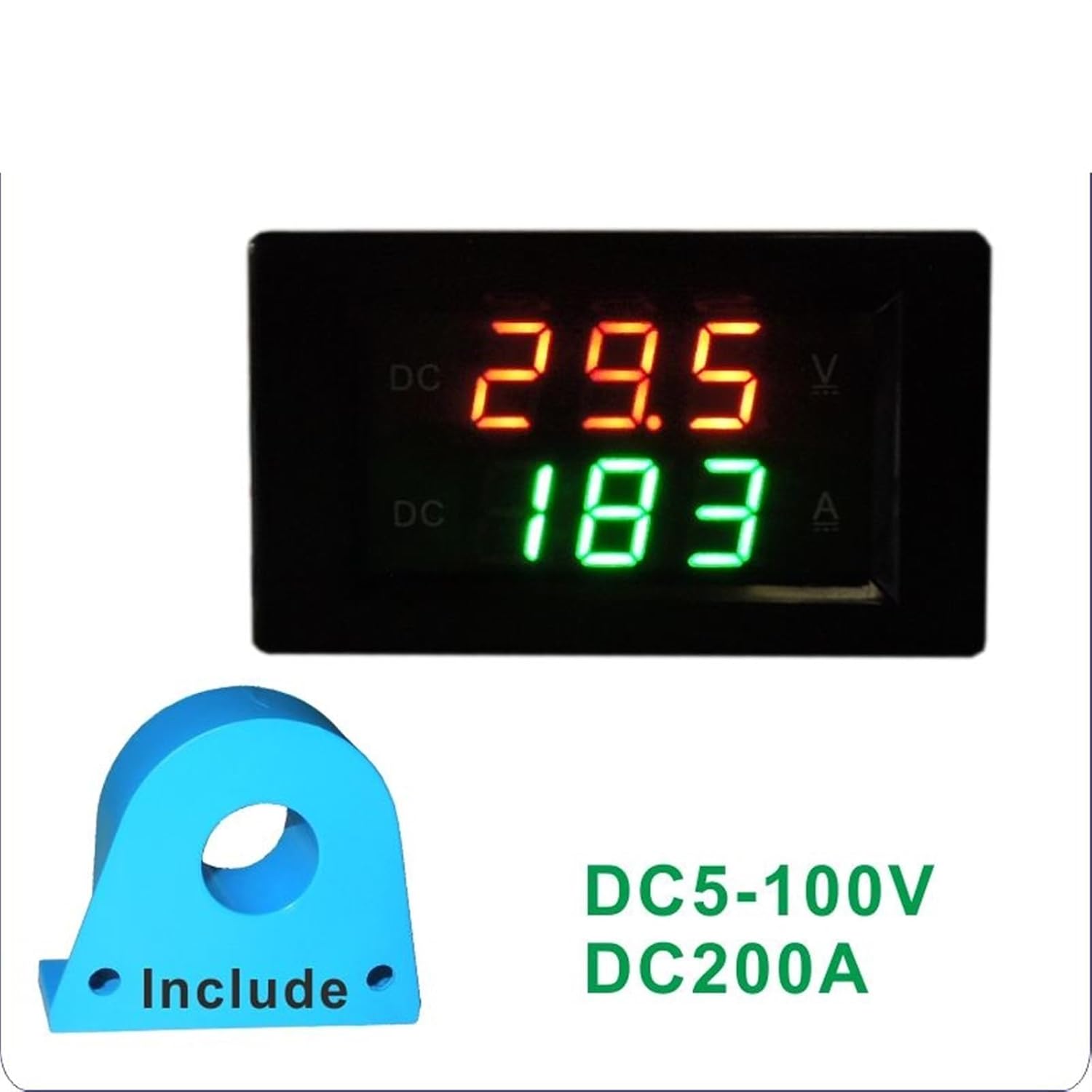 AmmetersAttention:1.Include a current 2.Please try not to install the meter and current around the high temperature, strong magnetic fieldand large , otherwise the accuracy will be affected.3.In order to obtain a higher precision measurement, it is recommended to "preheat for 5 minutes" beforeadjusting the calibration.4.Sincethe 24V battery charge full of floating voltage may be over 30V, so "no" recommended direct use it.5.When you select range, not the larger the better. the larger the range, the larger the error, it is recommendedthat it is 1.5 or 2 times as large as the actual test value.6.This meter and CT have been calibrated by the "one to one". Please don't mix it up when you use it in the laterperiod. If mixed, you need to recalibrate it.Technical Parameters: <;30mATest voltage:DC5-100VTest current:DC0-200ADisplay type:0.39'' LED with red and greenfonts Measurement rate: 500mS / timeMeasurement accuracy:1% (± 2 digits)CT wire length:150mmTerminal wire length:150mmDimension:70*40*30mmMounting hole:68*38mm.Features:1. The wide power supply range, with reverse polarity protection.2.Display voltage and current on thescreen at the same time.5.CT adopts the design of perforation type wire through the hole,without having to cut wires, without damage,withoutchanging the electric current wire can be achieved current measurements.6.Since CT and measured wire is isolated completely, this meter can be measured the current of the power positive, negative and any devices, don't need to worry about the ammeter "common ground".7.The positive and backward currentcan be measured,and the "positive" current is shown in the positive direction(the decimal point is always bright or not bright),and the "negative" current is shown in the reverse direction(th
