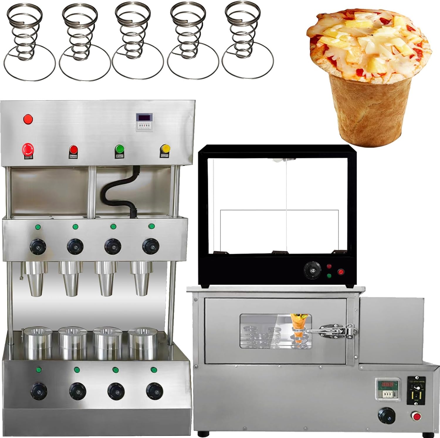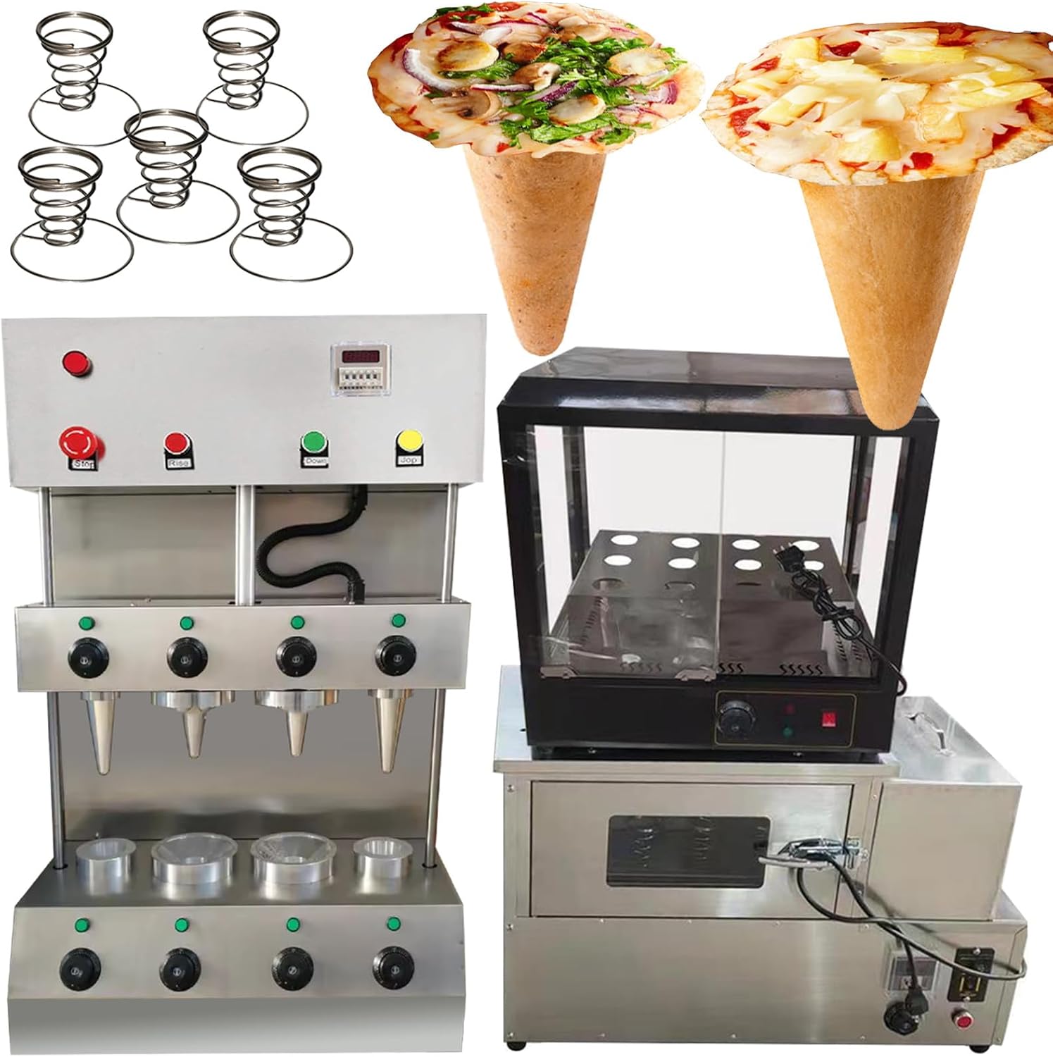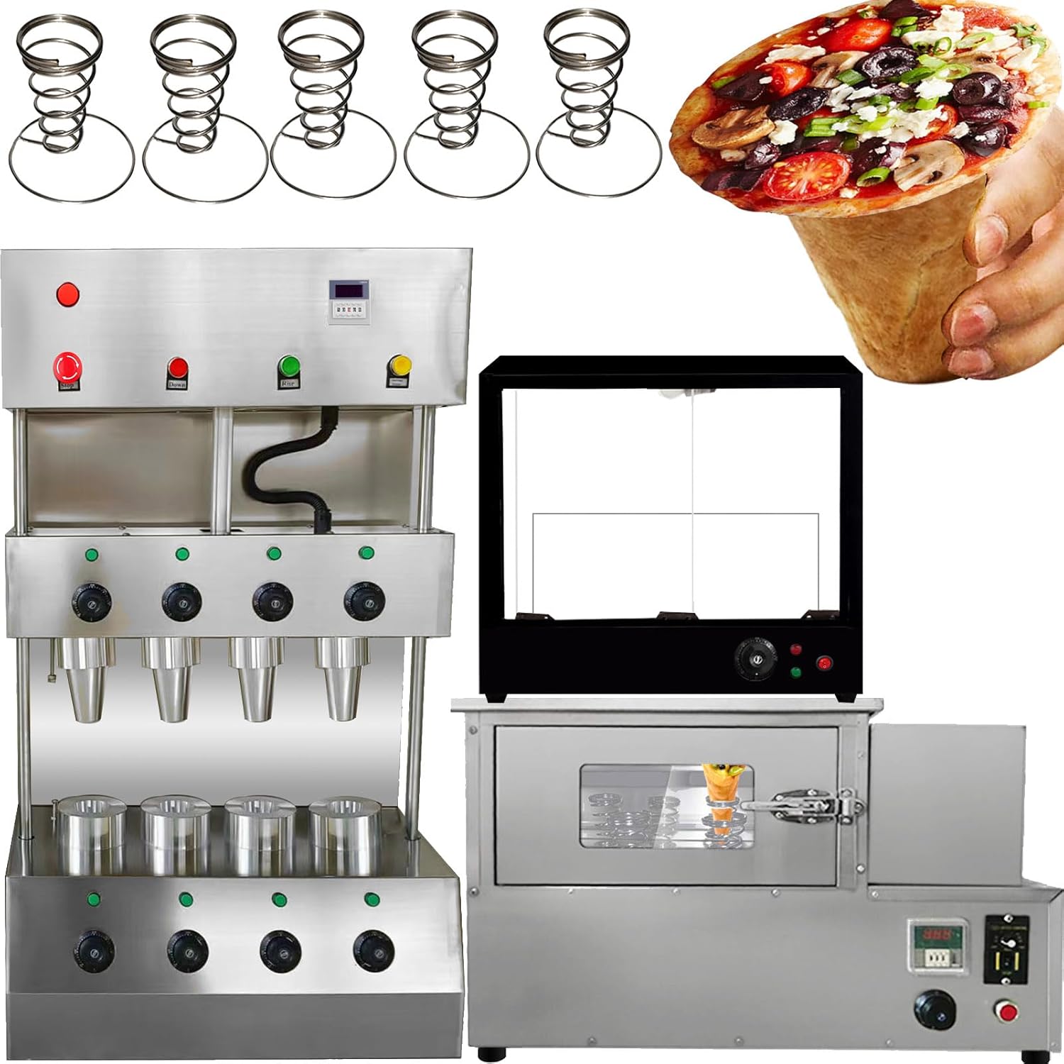 Parameters:This order includes 3 machines(This link includes pizza cone machine pizza oven and pizza display cabinet ) Specification:Model Number: PZ-4 Capacity of Work Bowl (Cup): 1000piece /h The quantity of mold: 4 molds nomal size:5.11*2.36*0.11inch/13*6*0.3CMAccessories: 5pcs pizza cone brackets Voltage: 110V /60HZ or 220V/50HZ Cone machine’s specification: Power: 3000w,Rated current: 27.2A(110V),13.6A(220V) Temperature Range: 0-572℉/0-300℃ Size of pizza machine: 20.86*13.77*38.58inch/530*350*980mm Pizza machine weight: 99.2LB/45kgOven machine’s specification: Power: 2000w,Rated current: 18.1A(110V),9A(220V)Temperature Range: 0-572℉/0-300℃ Size of pizza oven: 32.28*17.32*20.86inch/820*440*530mm Pizza oven weight: 88.18LB/40kg display warmer’s specification: Power: 600w,Rated current: 5.45A(110V),2.7A(220V) Size of display warmer: 20.47*20.47*15.35inch/52*52*39CM display warmer weight: 37.47LB/17kg with 12 holes and lighting Feature:1). The whole body of the machine is made of stainless steel, which is very environmentally friendly.Pizza Cone Machine Main Features1. Could adjust temperature according to different recipe. 2. The heating time of the mold can be controlled according to different dough. 3. The switch can control the production of the cone of the conical pizza.4.Flexible production: adjust the temperature of the top and bottom of the dies according to different pizza formula.5. Indicator reminder: There is an automatic alarm system inside the machine and the power light and the temperature indicator outside the machine. 6.Emergency preparedness: Press the emergency switch and then all the machine will stop working.Rotate Oven Machine Main Features:1. The machine has 4 heating rods, and it takes only 3-5 minute2. Can control the temperature 0-572℉/0-300℃, we recommend to control at 302-356℉/150-180 C.Pizza display warmer can put 12pcs pizza cone one timecan keep warmDimension:20.47*20.47*15.35inch/52*52*39CM Voltage:220v 110v Power:2.72HP/2000w Machine weight:37.47lb/17kg
