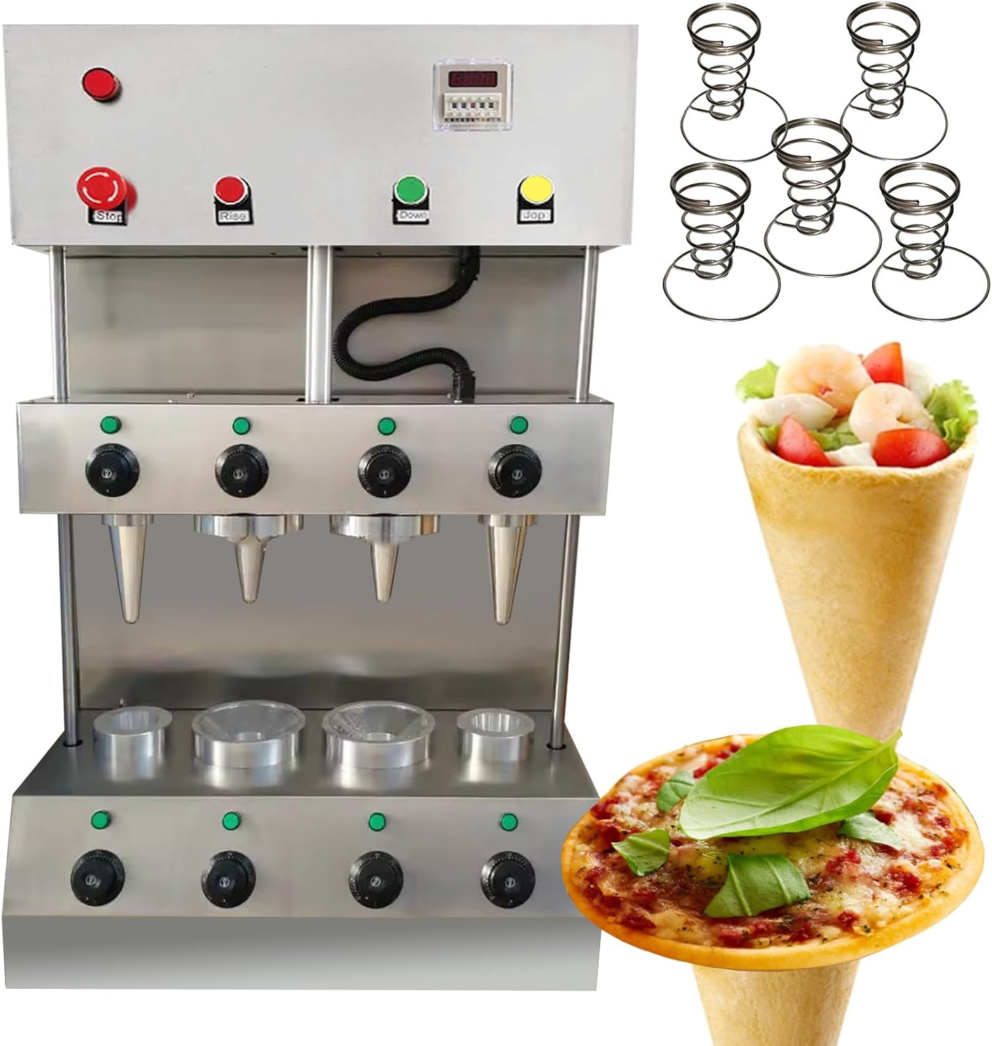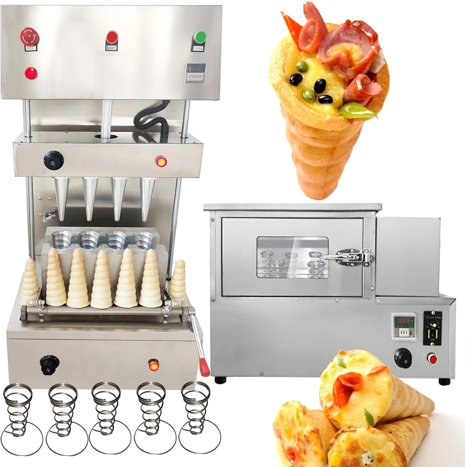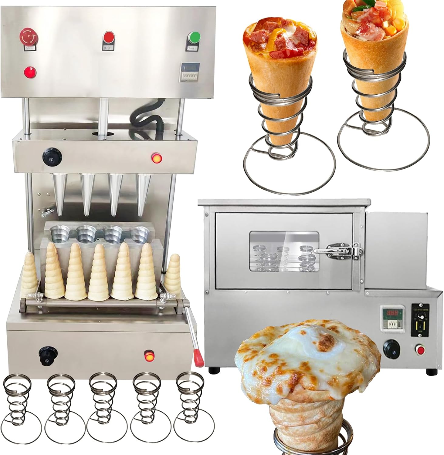 Parameters:This order includes 3 machines(This link includes pizza cone machine pizza oven and pizza display cabinet ) Specification:Model Number: PZ-4 Capacity of Work Bowl (Cup): 1000piece /h The quantity of mold: 4 molds nomal size:5.11*2.36*0.11inch/13*6*0.3CMAccessories: 5pcs pizza cone brackets Voltage: 110V /60HZ or 220V/50HZ Cone machine’s specification: Power: 3000w,Rated current: 27.2A(110V),13.6A(220V) Temperature Range: 0-572℉/0-300℃ Size of pizza machine: 20.86*13.77*38.58inch/530*350*980mm Pizza machine weight: 99.2LB/45kgOven machine’s specification: Power: 2000w,Rated current: 18.1A(110V),9A(220V)Temperature Range: 0-572℉/0-300℃ Size of pizza oven: 32.28*17.32*20.86inch/820*440*530mm Pizza oven weight: 88.18LB/40kg display warmer’s specification: Power: 600w,Rated current: 5.45A(110V),2.7A(220V) Size of display warmer: 20.47*20.47*15.35inch/52*52*39CM display warmer weight: 37.47LB/17kg with 12 holes and lighting Feature:1). The whole body of the machine is made of stainless steel, which is very environmentally friendly.Pizza Cone Machine Main Features1. Could adjust temperature according to different recipe. 2. The heating time of the mold can be controlled according to different dough. 3. The switch can control the production of the cone of the conical pizza.4.Flexible production: adjust the temperature of the top and bottom of the dies according to different pizza formula.5. Indicator reminder: There is an automatic alarm system inside the machine and the power light and the temperature indicator outside the machine. 6.Emergency preparedness: Press the emergency switch and then all the machine will stop working.Rotate Oven Machine Main Features:1. The machine has 4 heating rods, and it takes only 3-5 minute2. Can control the temperature 0-572℉/0-300℃, we recommend to control at 302-356℉/150-180 C.Pizza display warmer can put 12pcs pizza cone one timecan keep warmDimension:20.47*20.47*15.35inch/52*52*39CM Voltage:220v 110v Power:2.72HP/2000w Machine weight:37.47lb/17kg